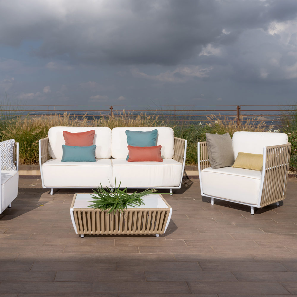 Gracias al uso de materiales especiales de alta calidad, este salón de exterior garantiza una excelente resistencia a la intemperie, la suciedad, el polvo y las manchas.