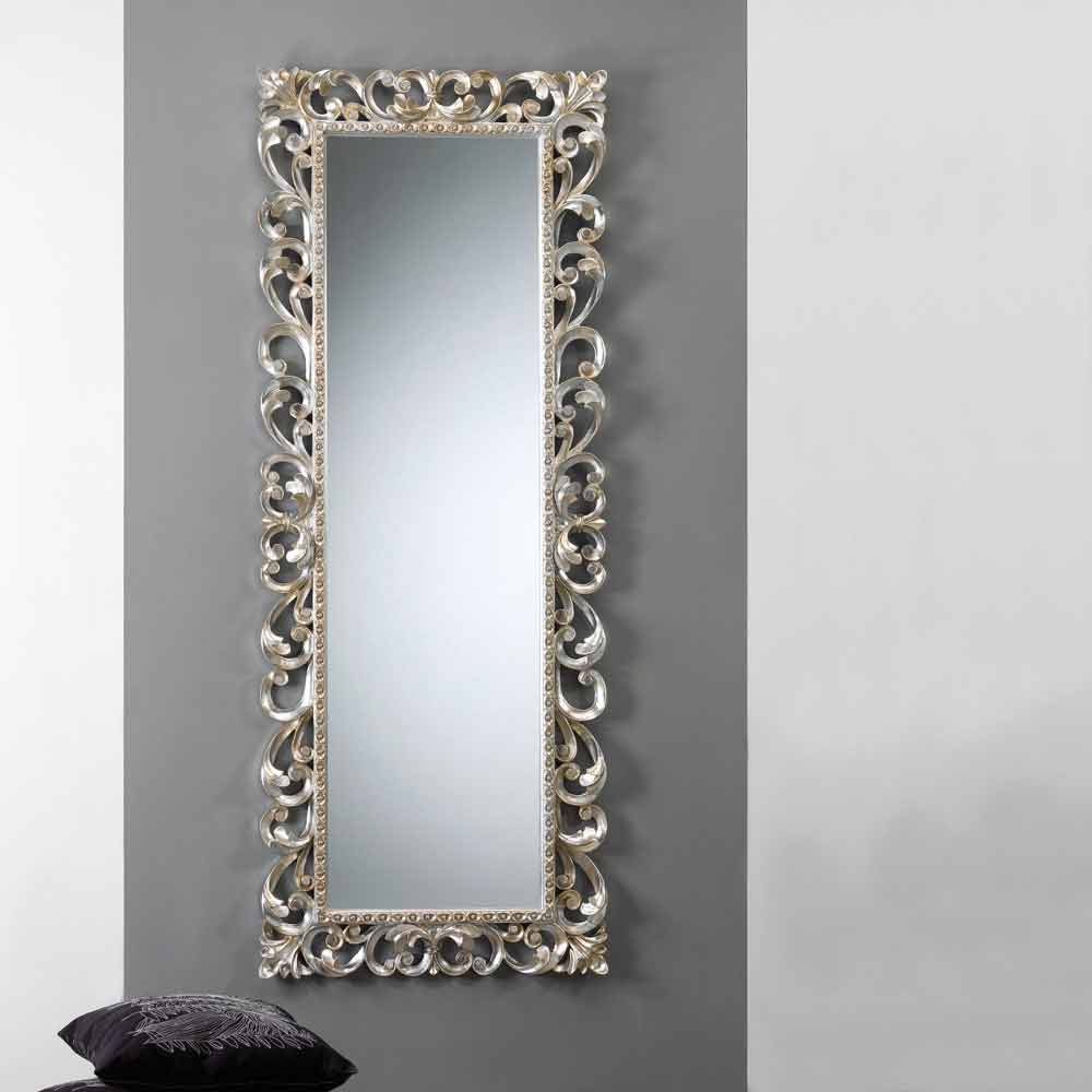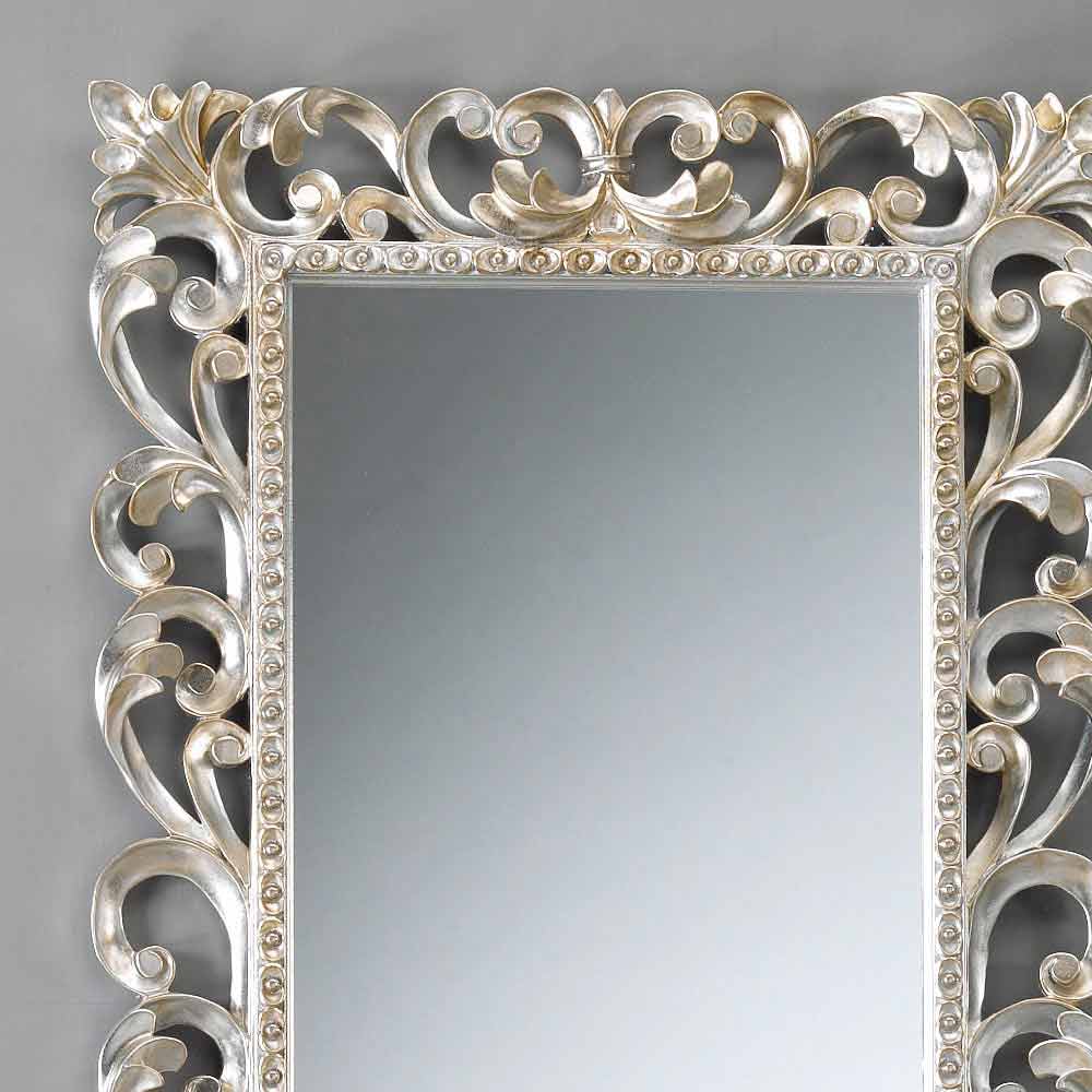 El espejo de París se caracteriza por una artesanía realizada con materiales de alta calidad y el uso de la experiencia de hábiles artesanos italianos. El bastidor está hecho de madera decoradas con tallas. acabado en pan de plata. Espejo con vidrio biselado, de 4 mm de espesor. Made in Italy. Para colgar, ya sea vertical u horizontalmente.