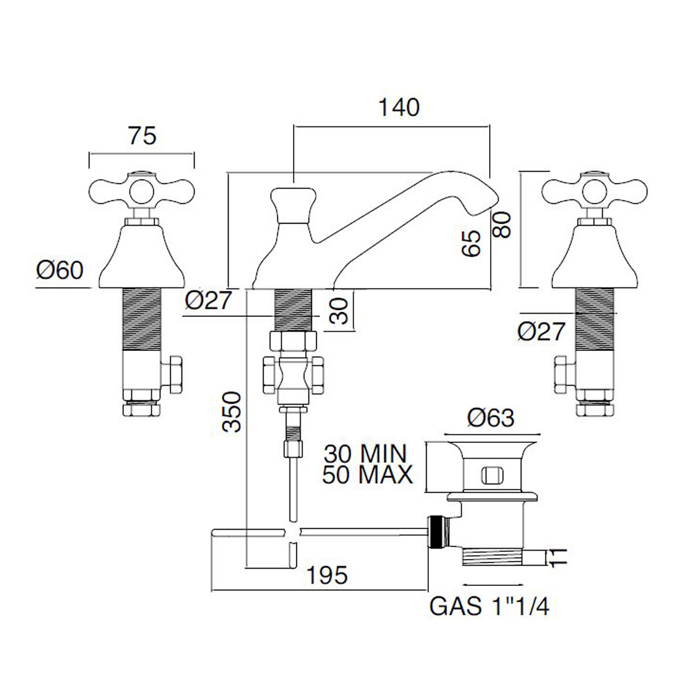 Grifo de lavabo de 3 orificios con desagüe de latón, artículo artesanal fabricado en Italia.