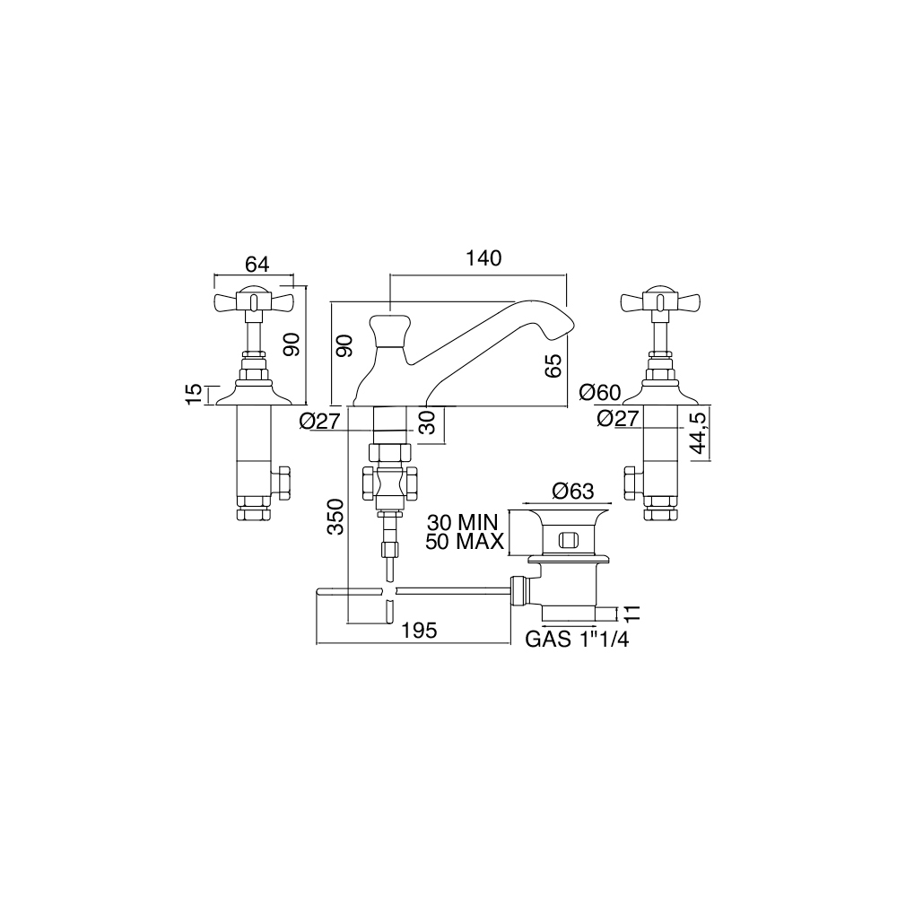 Grifo de lavabo Katerina de 3 orificios en diseño vintage de latón, fabricado en Italia.