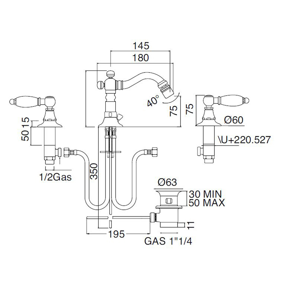 Grifos para bidé clásicos de 3 orificios con palancas de latón Made in Italy - Noriana