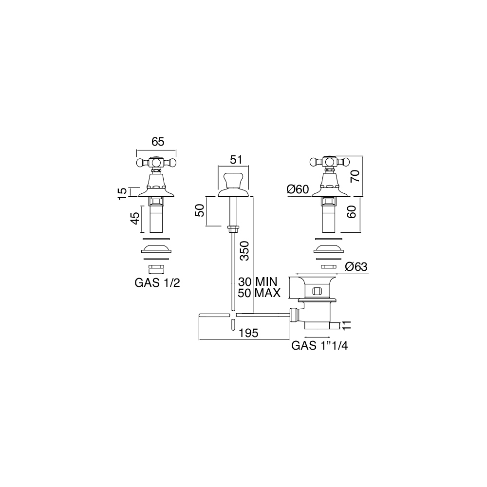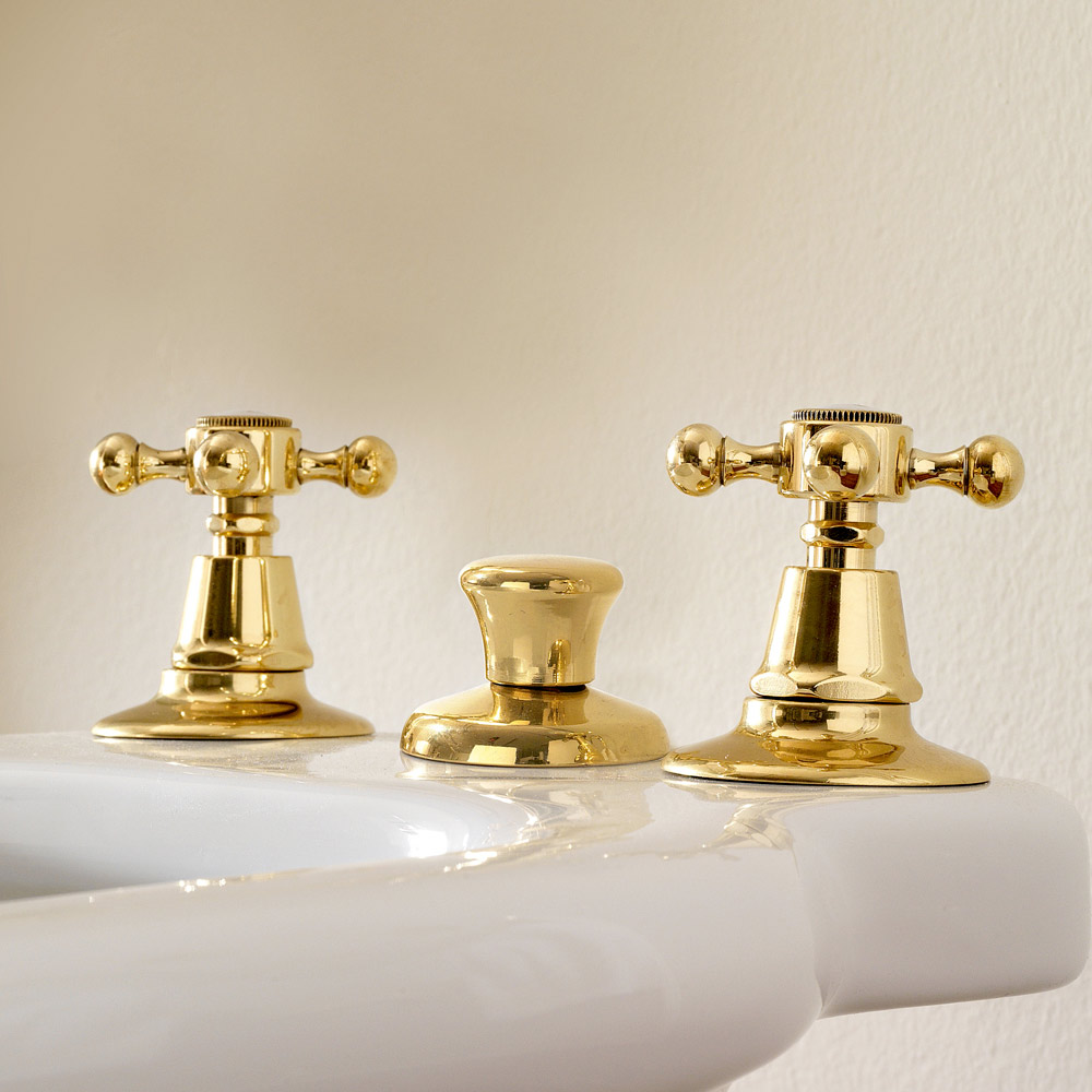 Grifo de bidé vintage de 3 orificios con salida interna fabricado en Italia en latón, Ursula.