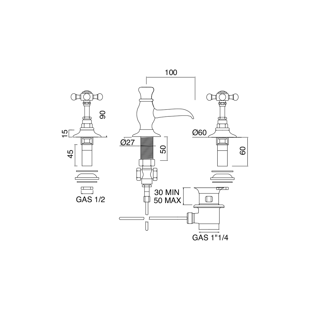 Grifo de latón de 3 orificios para bidé de diseño vintage Elisea, fabricado en Italia.