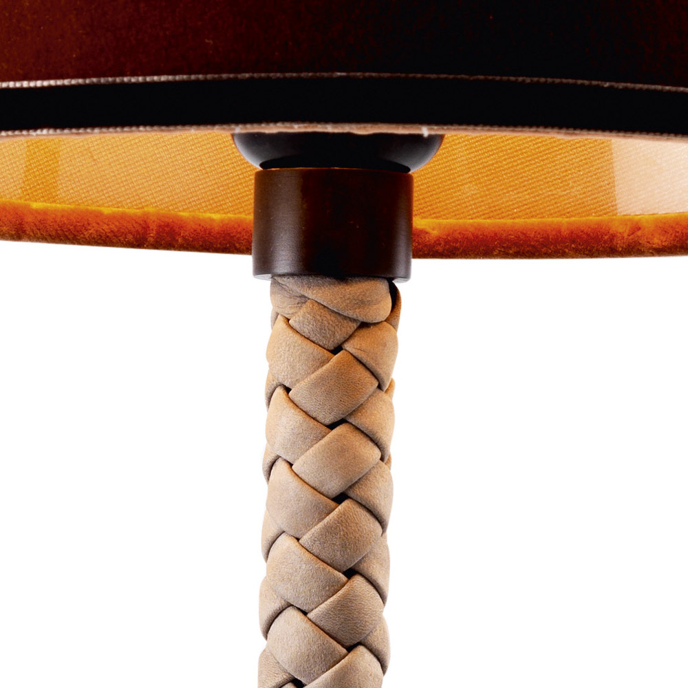 Lámpara de mesa en tela y cuero hecha en Italia Grilli Snake Sobremesa de diseño moderno, único y elegante. Compuesto por un soporte metálico cubierto de cuero turbo con tejido manual; sombrero de tela.
