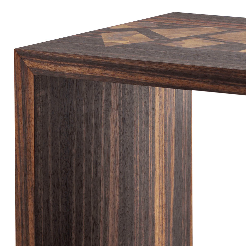 Su estructura es de chapa de madera enchapada en ébano e inserciones de carganello con raíces de nogal. Acabado mate.