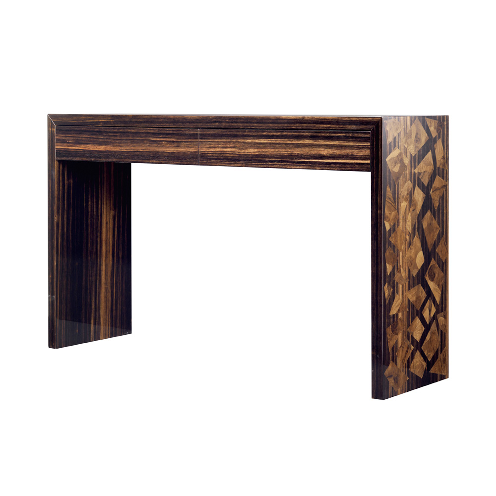 Compuesto por una estructura de madera enchapada en ébano con inserciones de cordedolo de cerdas de nogal. La base es de madera maciza de touliper barnizada. Los dos cajones están equipados con el sistema sylent y en su interior tienen la parte superior cubierta de cuero.