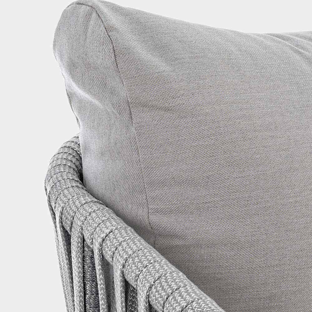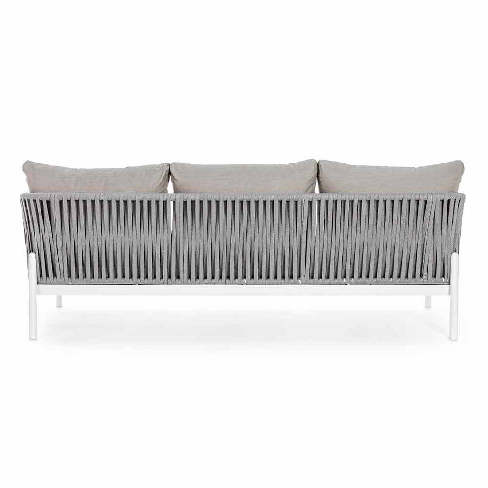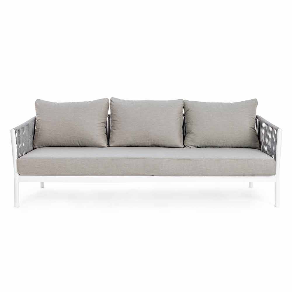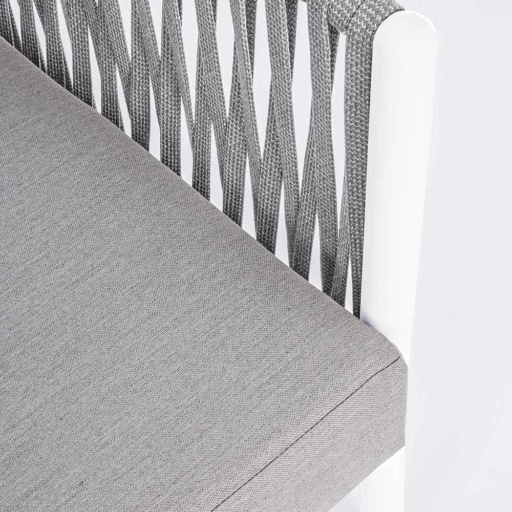 Sofá de exterior de diseño moderno en aluminio blanco con tejido de cuerda y cojines grises.
