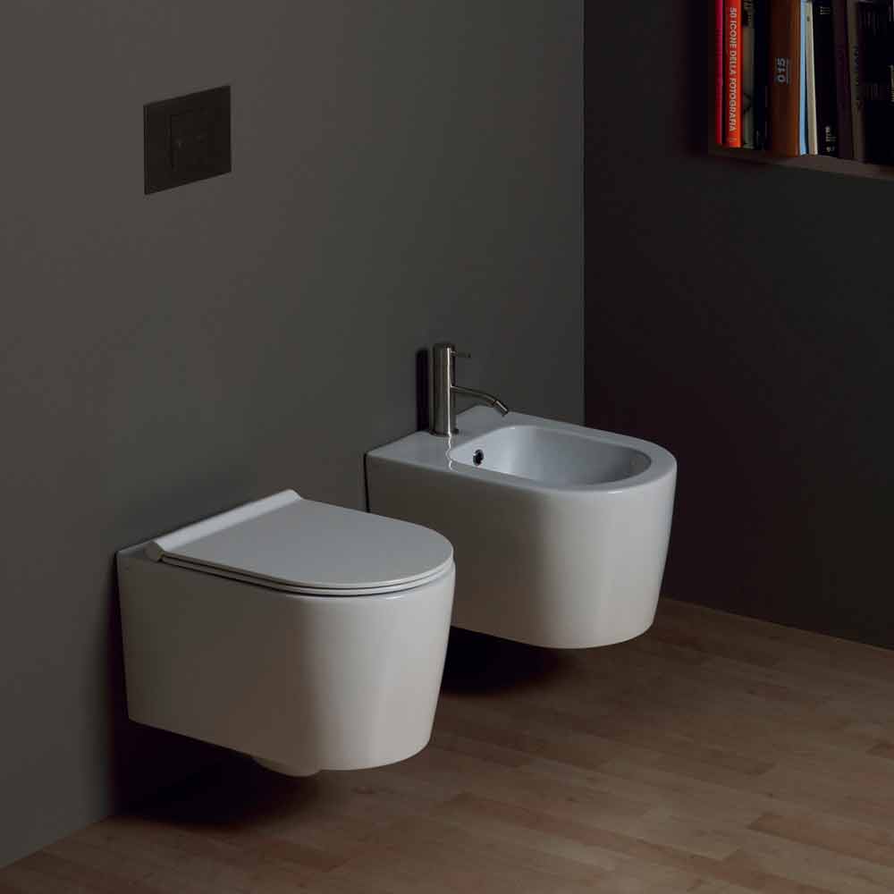 Inodoro suspendido de cerámica de diseño moderno Shine Square, hecho en Italia Recipiente cerámico suspendido con kit de fijación rápida y soportes de fijación incluidos. Opciones Disponibles: - asiento blanco con bisagras cromadas - asiento termoestable, bisagras cromadas de cierre suave