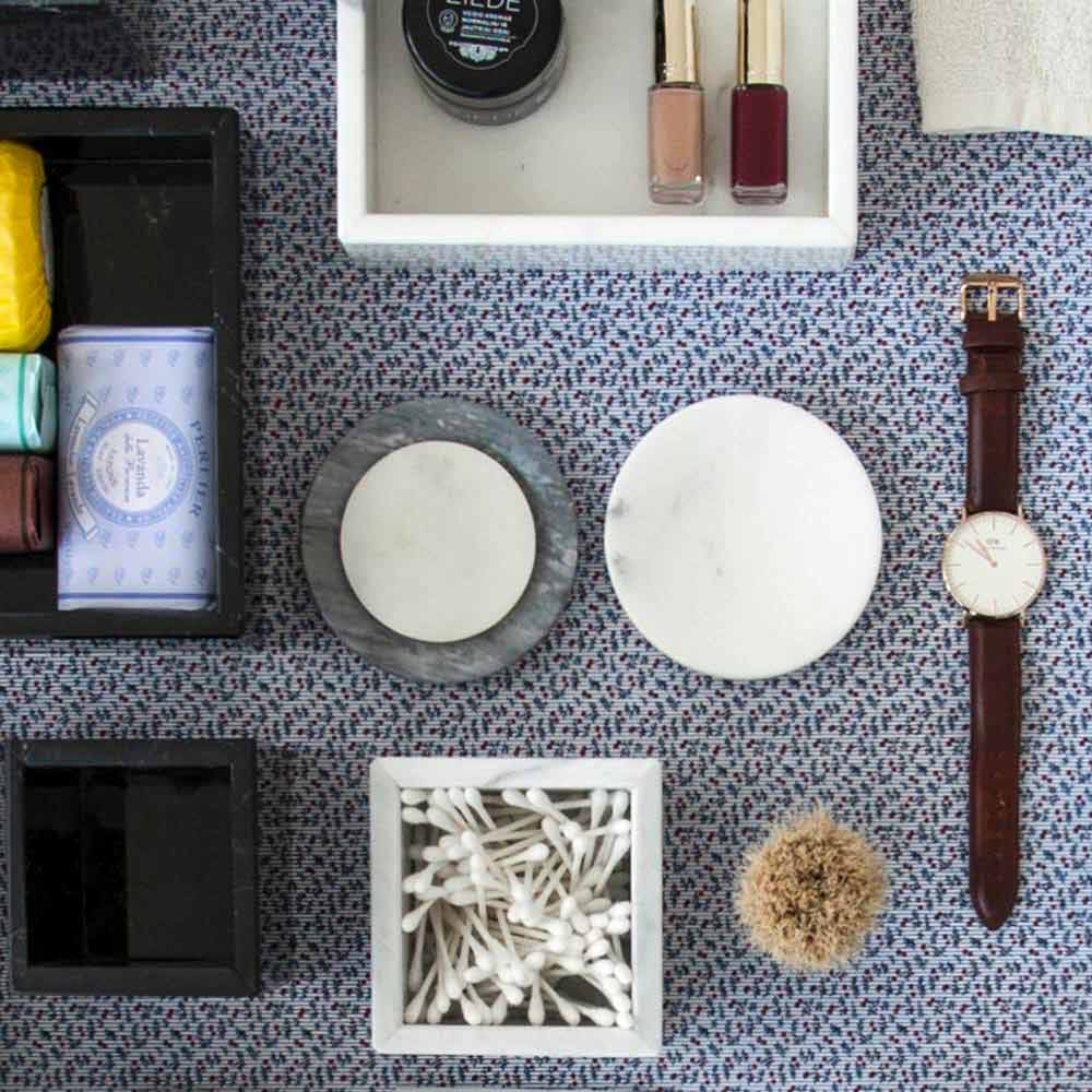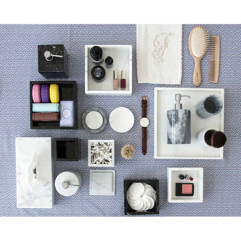 Jabonera de baño fabricada íntegramente en fino mármol blanco de Carrara . Es una pieza única ya que cada bloque de mármol utilizado se diferencia de los demás por vetas y matices.