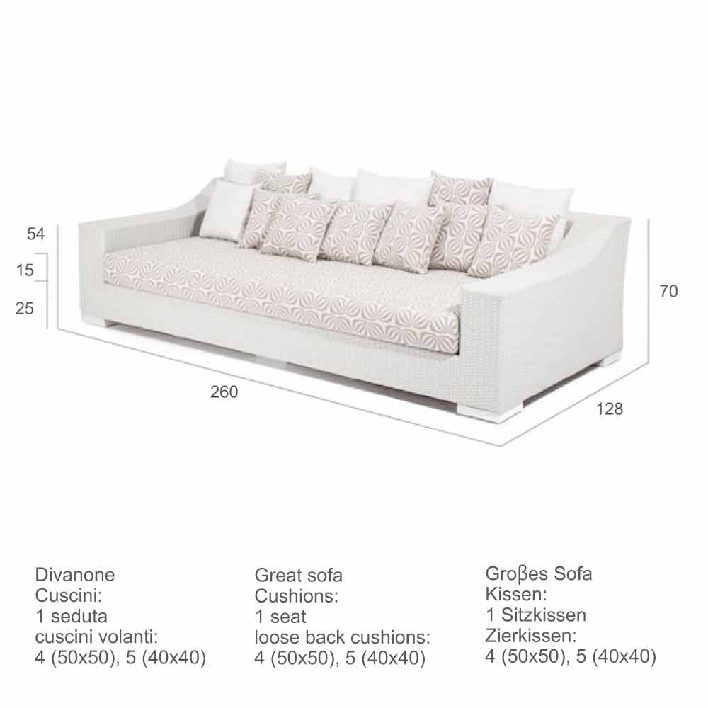 Completar con un 'relleno de espuma de poliuretano. La tapicería consiste en una sola sesión, y está adornada por una miríada de cojines sueltos, todo cubierto por un tejido Tempotest, rayos resistentes al agua y UV y disponible en diferentes variaciones cromáticas, color sólido.