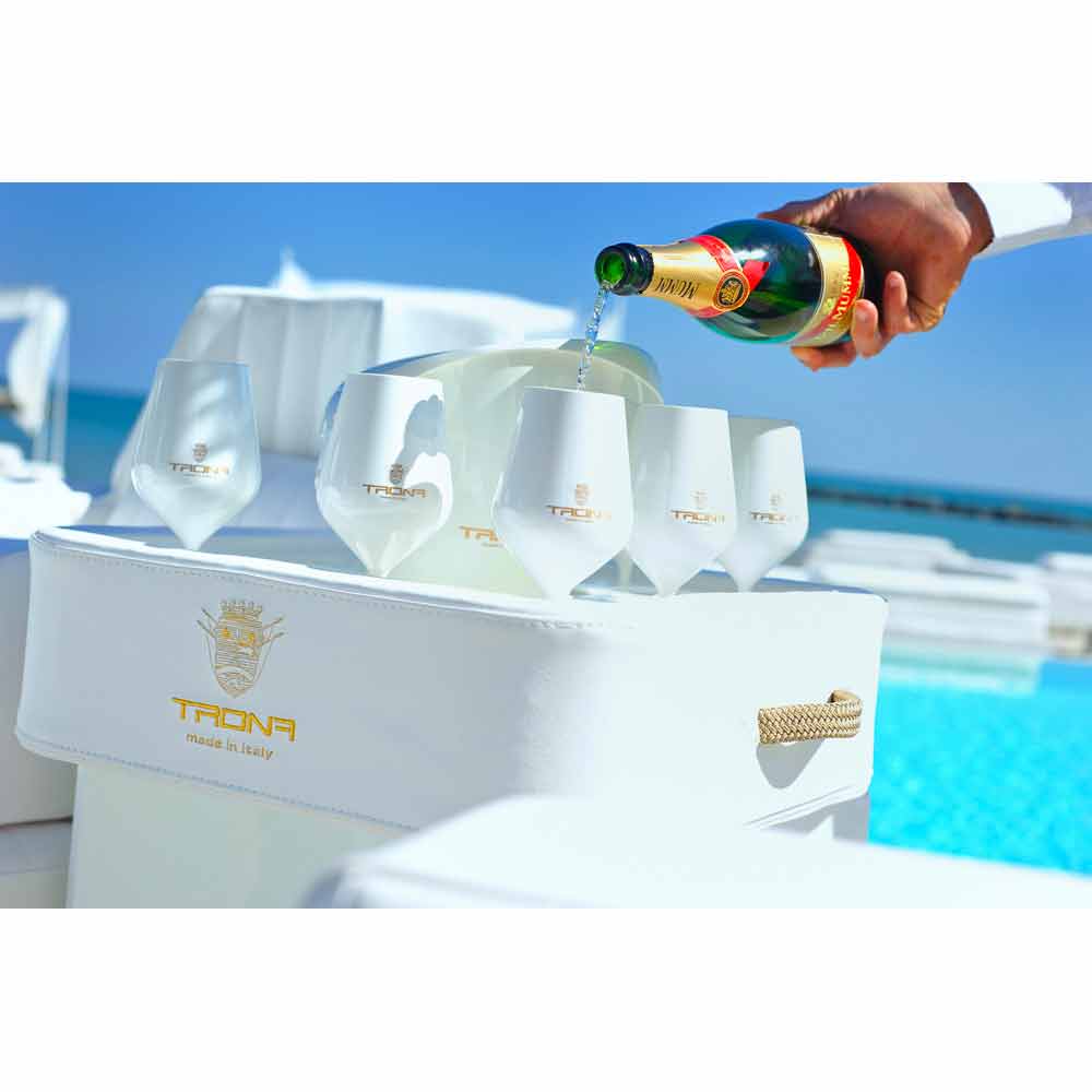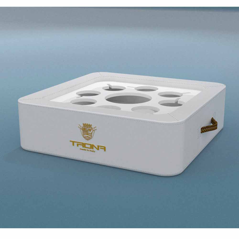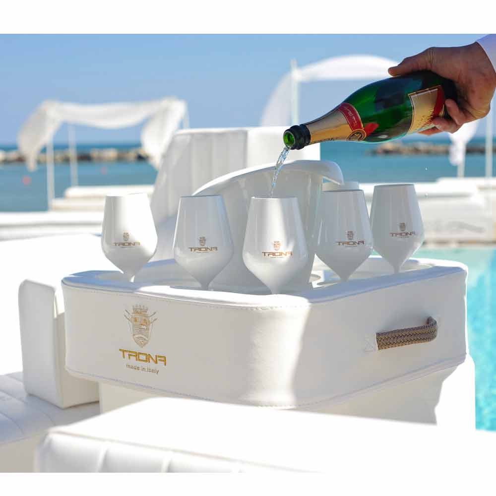 Gracias a la lámina de plexiglás perforada especial, Trona admite la botella, el cubo de hielo y las gafas con total seguridad, sin riesgo de vuelco. Trona, de hecho, tiene un orificio central, como un cubo de hielo / portabotellas y 8 orificios adecuados para llevar una copa o vasos de cóctel.