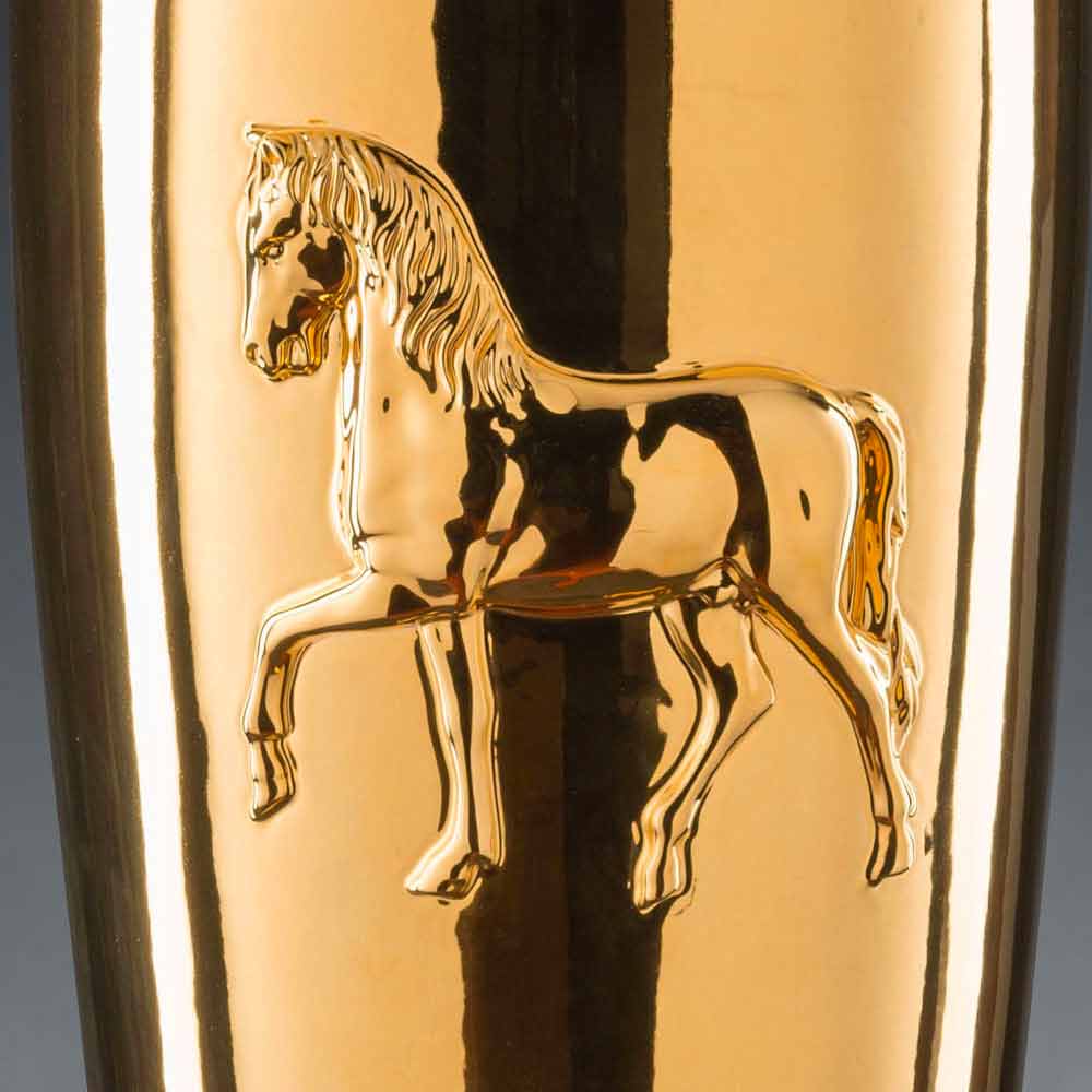 Jarrón artesanal para interiores en cerámica con acabado dorado brillante Made in Italy.
