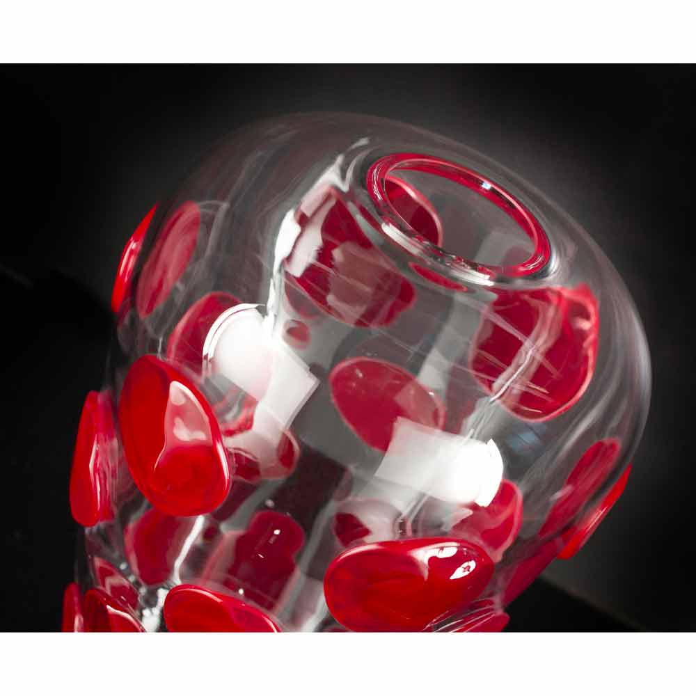 Elegante jarrón para interiores en cristal soplado de Murano transparente con detalles redondos en rojo vivo realizado mediante un proceso íntegramente Made in Italy . Un complemento que combina la extrema elegancia del cristal de Murano y sus maravillosas prestaciones con un diseño moderno y alegre para dar vida a una idea de mobiliario exclusivo y vanguardista capaz de enriquecer cualquier espacio doméstico y no con un toque de color . Un estilo ideal para los más variados ambientes, desde el mobiliario del hogar hasta el de hoteles, restaurantes, espacios contract, spas pero también como escenario para eventos y bodas.