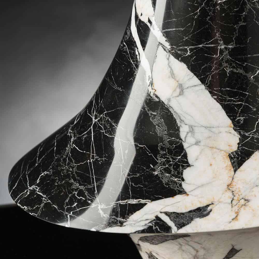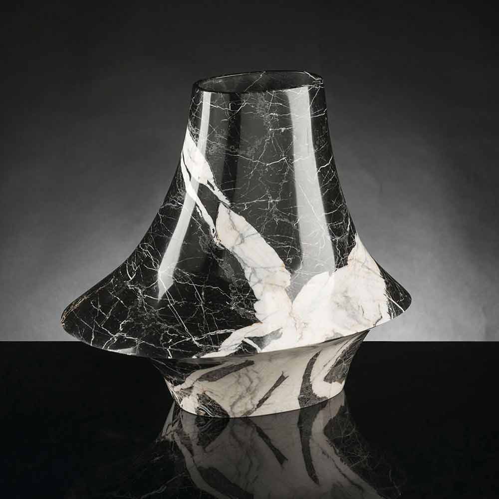 Jarrón ornamental de interiorde mármol negro con vetas blancas.a través de una producción 100% Made in Italy . Su producción se lleva a cabo mediante el procesamiento de piedras naturales con pantógrafos de 5 ejes que permiten obtener formas más complejas que los simples volúmenes de rotación. Este elegante mueble nace de la unión entre el estudio de los fenómenos naturales y la interacción de los materiales utilizados con la tecnología humana para dar vida a un estilo de mobiliario único y vanguardista. El resultado es un elemento decorativo exclusivo capaz de enriquecer cualquier ambiente con una estética moderna y refinada con personalidad. Un estilo ideal para los más variados ambientes, desde el mobiliario del hogar hasta el de hoteles, restaurantes, espacios contract, spas pero también como escenario para eventos y bodas.