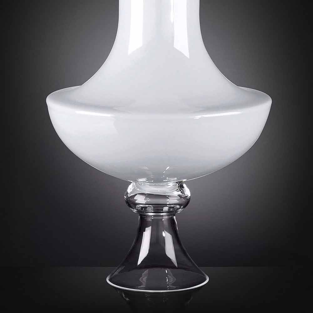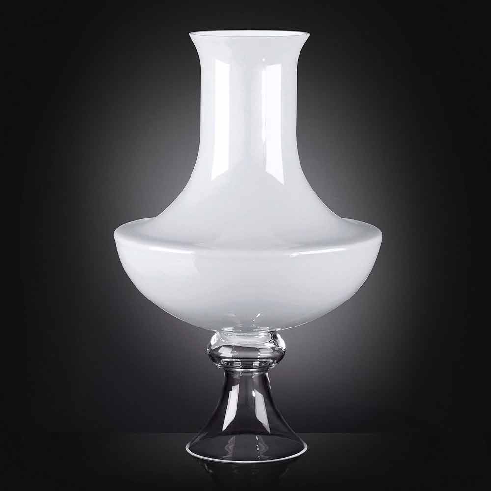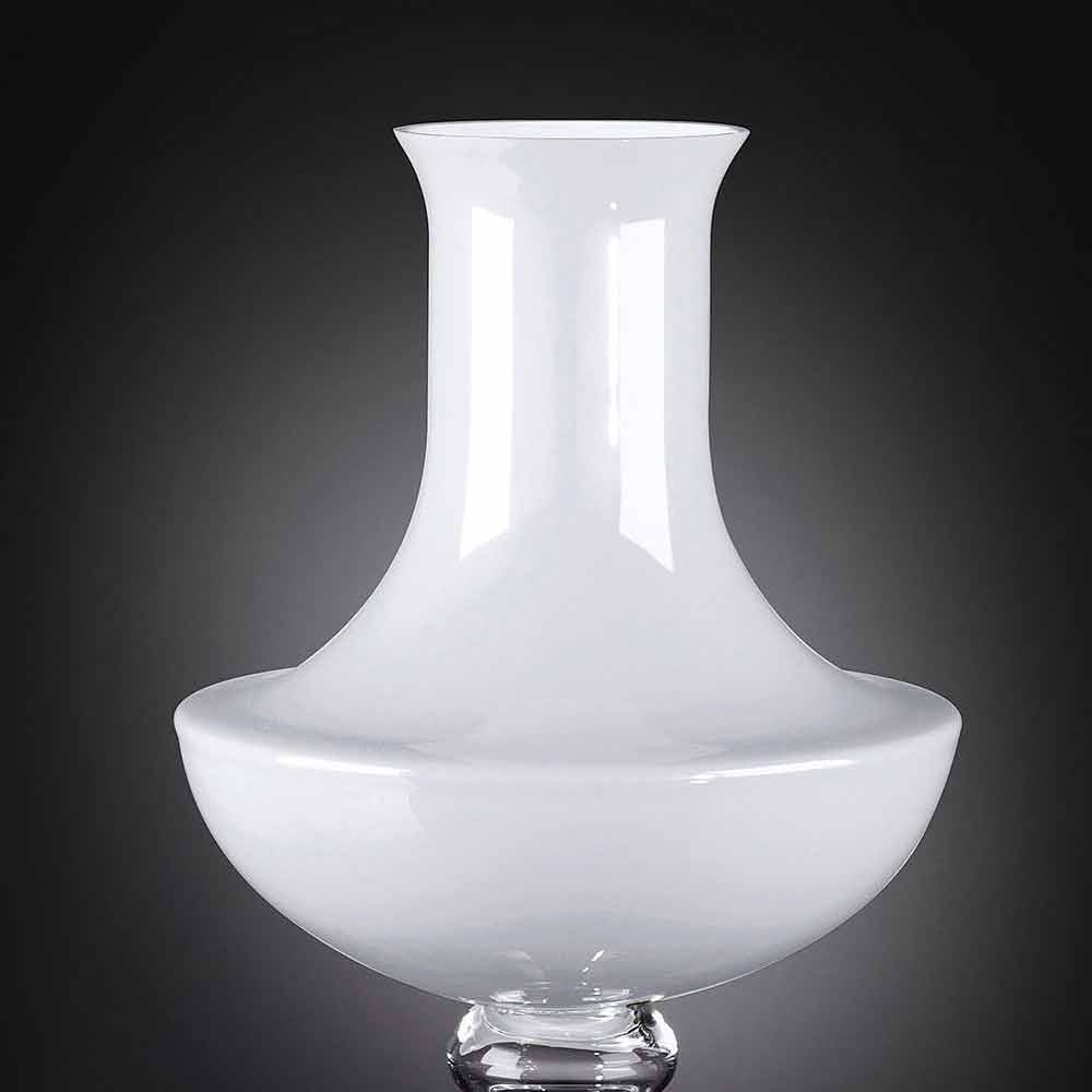 Florero moderno para interiores en vidrio blanco con base transparente realizado mediante un proceso 100% Made in Italy . Un complemento caracterizado por una estética simple y limpia y una figura perfilada por formas suaves y líneas sinuosas que permiten ser utilizado en cualquier ambiente con un estilo refinado gracias también a la elegancia atemporal del vidrio, un material de calidad y de alto valor. . Un diseño ideal para los más variados ambientes, desde el mobiliario del hogar hasta el de hoteles, restaurantes, espacios contract, spas pero también como escenario para eventos y bodas.