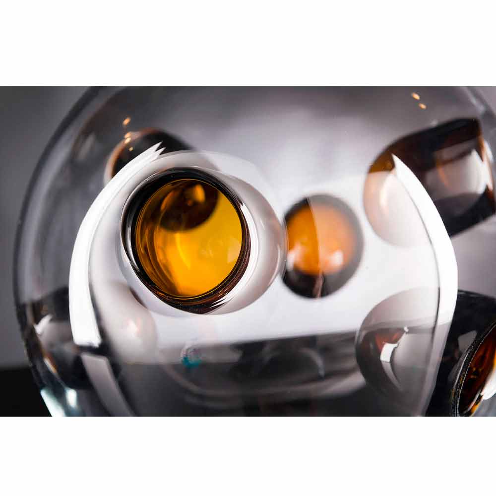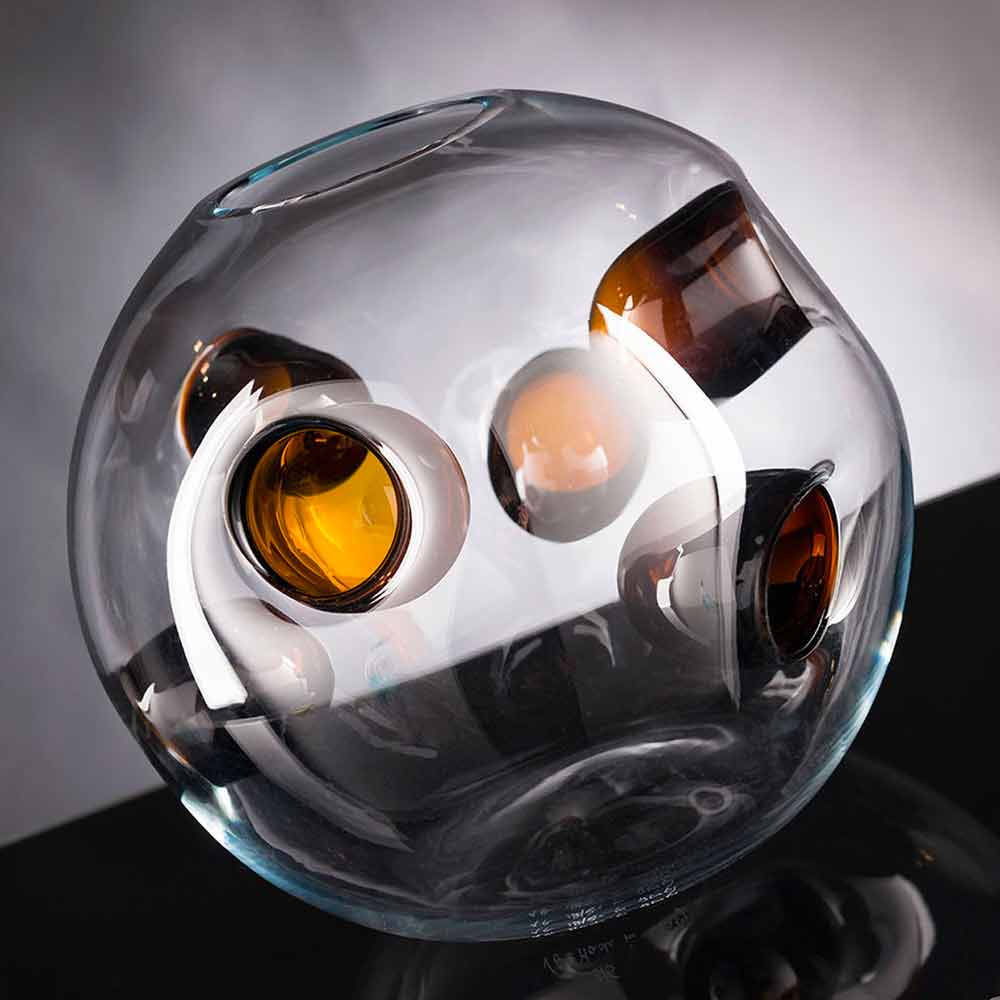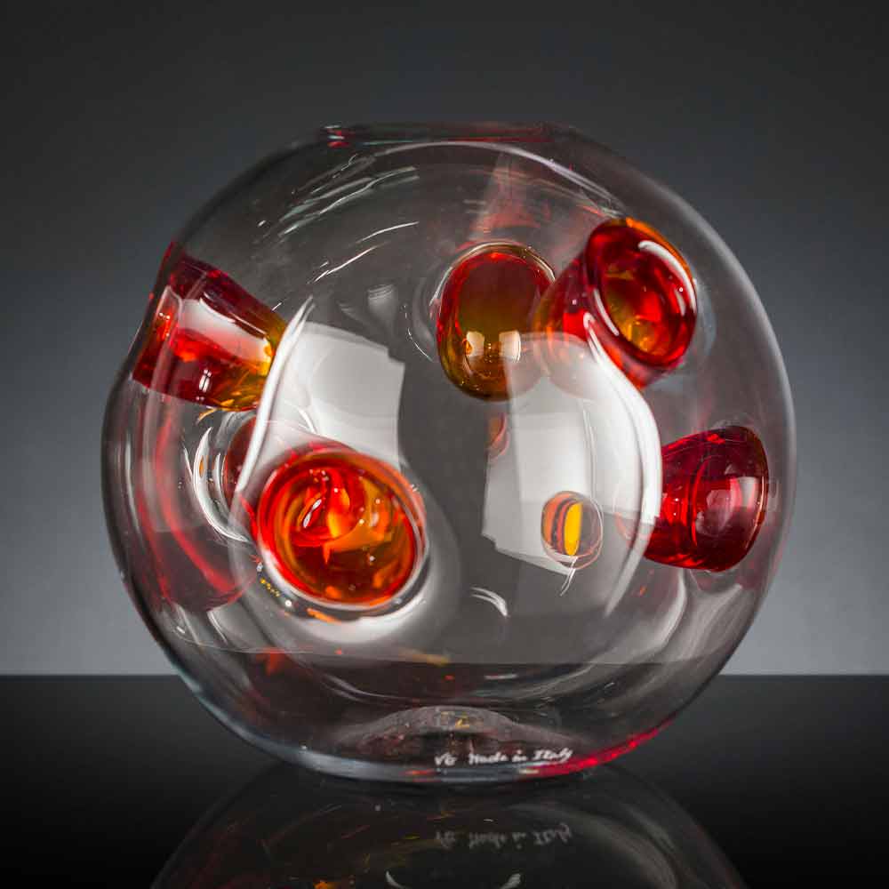 Florero interior moderno con forma esférica en vidrio soplado de Murano transparente con detalles de color fabricado íntegramente en Italia . Un diseño que combina todas las peculiaridades y el valor del cristal de Murano con la innovación y originalidad de un estilo moderno caracterizado por toques de color únicos y vanguardistas para un resultado único capaz de enriquecer cualquier situación estilística, creando una armonía perfecta . Un estilo ideal para los más variados ambientes, desde el mobiliario del hogar hasta el de hoteles, restaurantes, espacios contract, spas pero también como escenario para eventos y bodas.