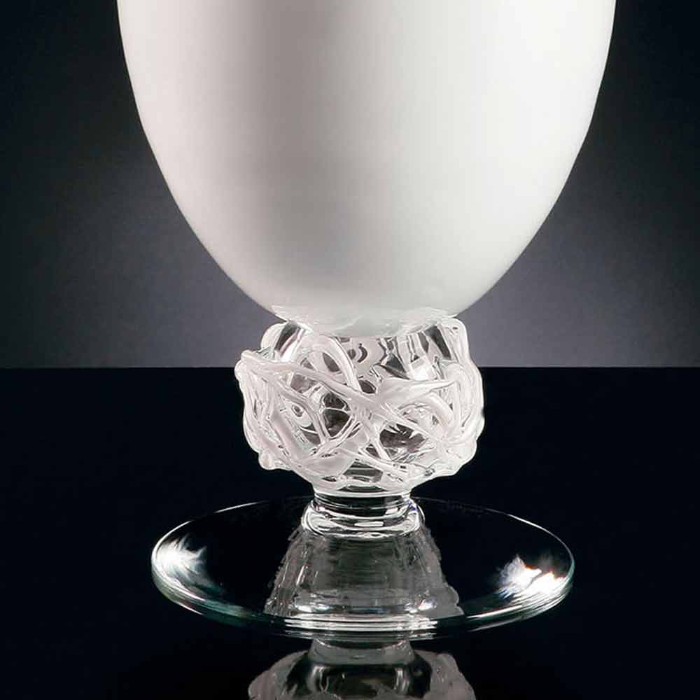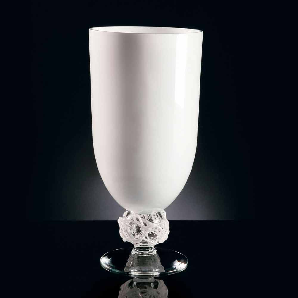 Jarrón artesanal para interiores en vidrio blanco con base transparente Made in Italy.