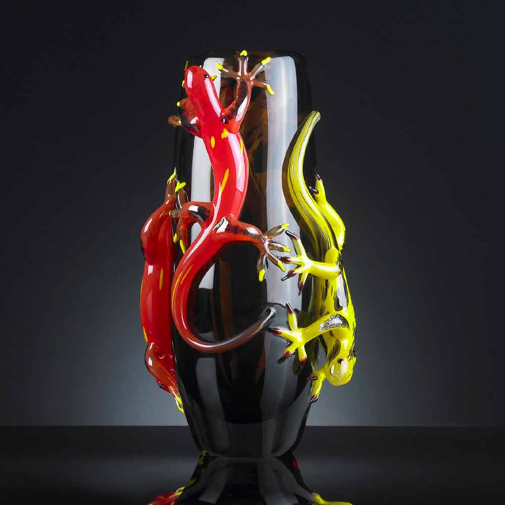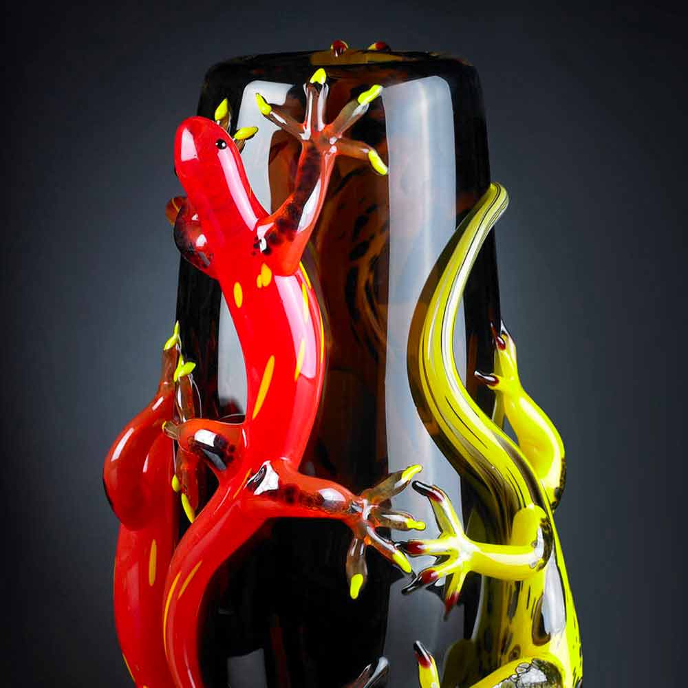vidrio marrón hecho a mano en Italia por maestros vidrieros expertos en el sector durante generaciones, enriquecido con 4 geckos en tonos de amarillo y rojo. Un excéntrico elemento decorativo capaz de dar un
