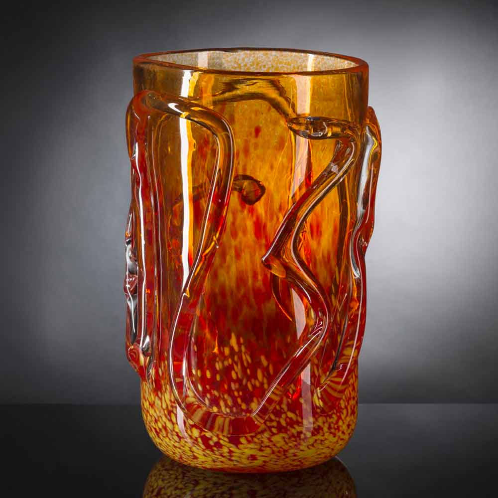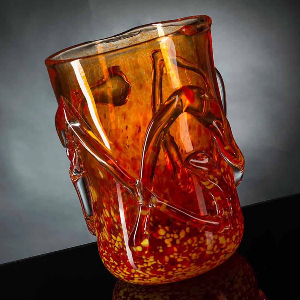 Jarrón decorativo para interiores fabricado íntegramente en Italia en vidrio soplado de Murano con acabado naranja con estructura trabajada. El maravilloso diseño elegante y colorido que caracteriza a este complemento representa su verdadera fuerza, permitiéndole enriquecer y personalizar cualquier situación estilística con gusto y clase gracias también al uso del cristal de Murano, un material de calidad y alto valor . El particular procesamiento que recubre toda la estructura del jarrón enfatiza su sofisticada personalidad, dando vida a una idea de mobiliario exclusivo y vanguardista. Un estilo ideal para los más variados ambientes, desde el mobiliario del hogar hasta el de hoteles, restaurantes, espacios contract, spas pero también como escenario para eventos y bodas.