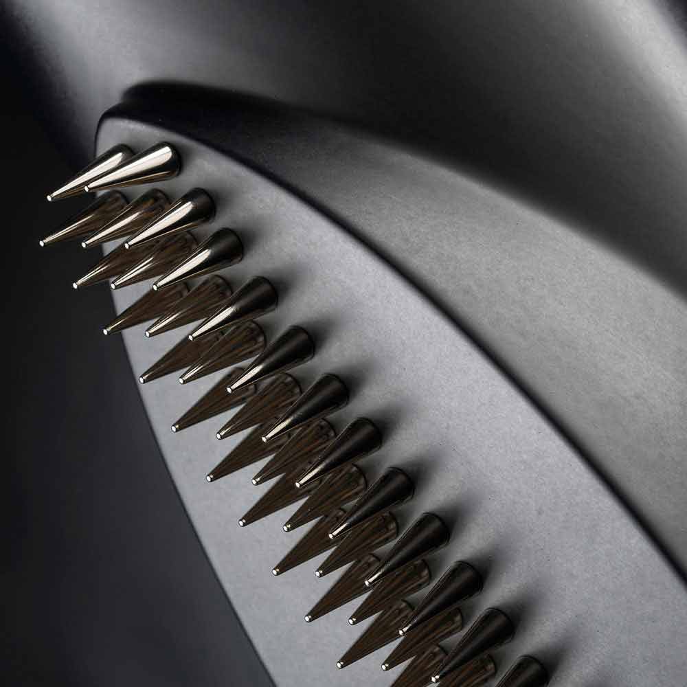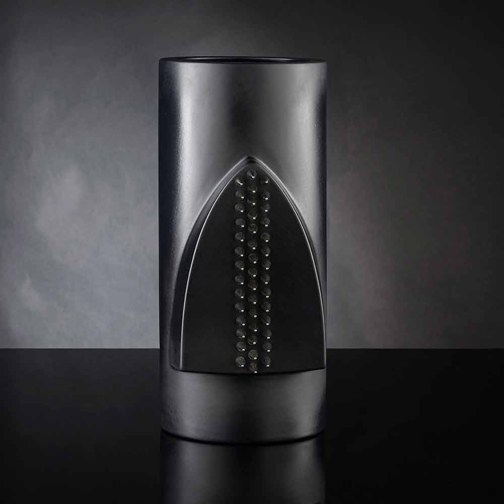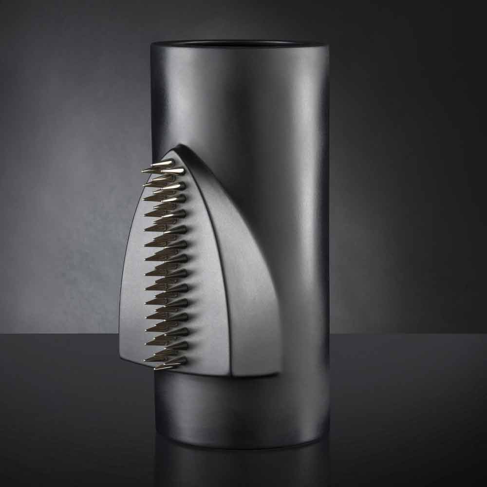 Jarrón ornamental de interior en cerámica negra mate enriquecida con clavos de acero,hecho a través de una artesanía Made in Italy . Del encuentro entre la extrema elegancia de la cerámica y el toque moderno de los detalles metálicos, nace un elemento decorativo para ambientes modernos, lleno de personalidad y carácter, ideal para quienes aman amueblar sus espacios con accesorios de fuerte impacto escenográfico que pueden ayudan a completar el aspecto de la habitación creando una armonía perfecta. La producción artesanal representa uno de sus puntos fuertes ya que aumenta y enfatiza el valor y la calidad del producto, dando vida a un resultado exclusivo y refinado . Un estilo ideal para los más variados ambientes, desde el mobiliario del hogar hasta el de hoteles, restaurantes, espacios contract, spas pero también como escenario para eventos y bodas.