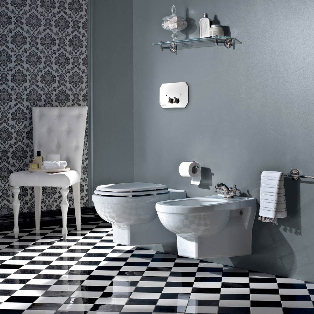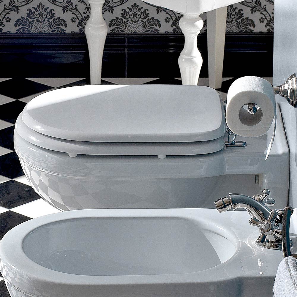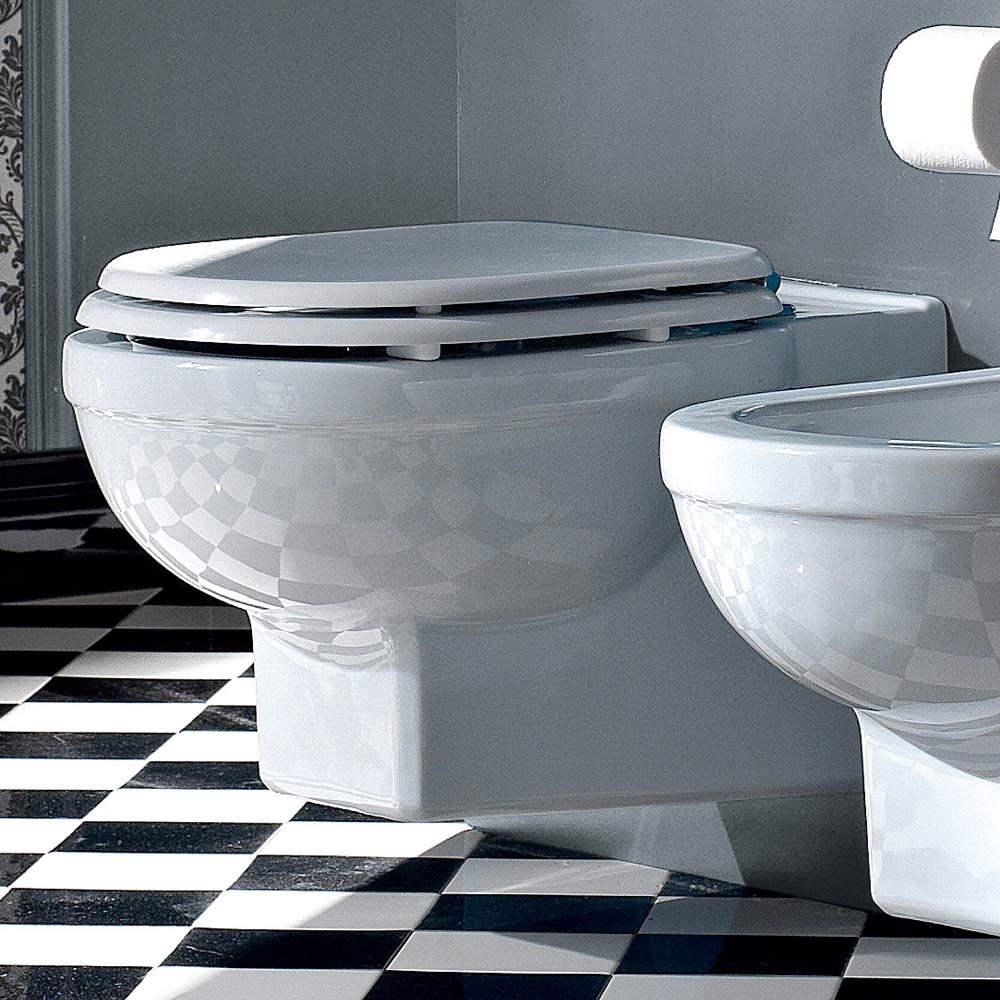 Inodoro con suspensión de diseño clásico en cerámica blanca fabricado en Italia.