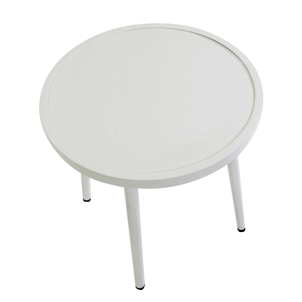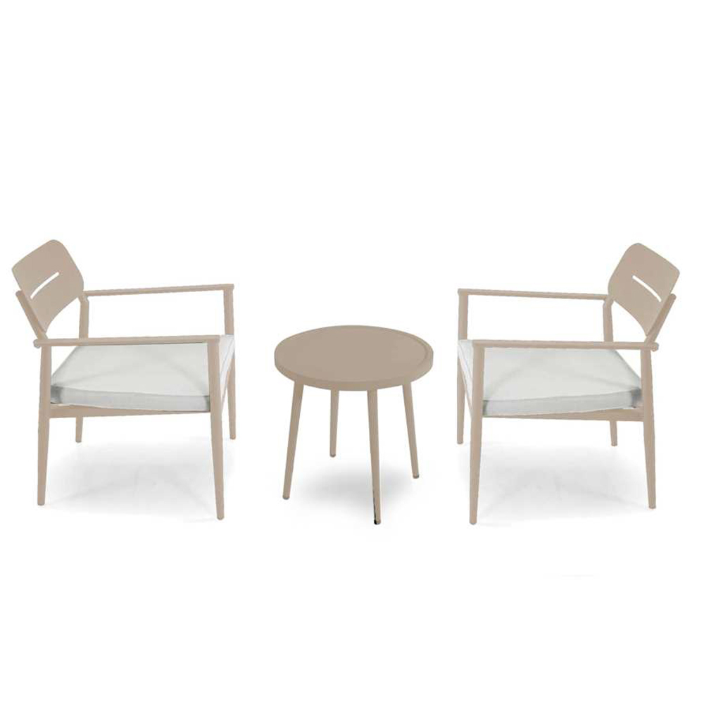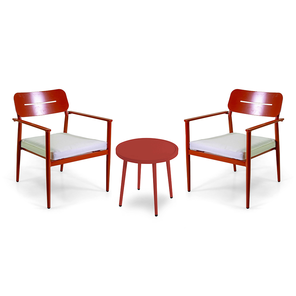 La mesa a juego con su diseño esencial completa el conjunto, ofreciendo una solución práctica para colocar bebidas o libros, convirtiendo su espacio exterior en una verdadera extensión de la zona de estar, ideal para momentos de relax o para recibir invitados.