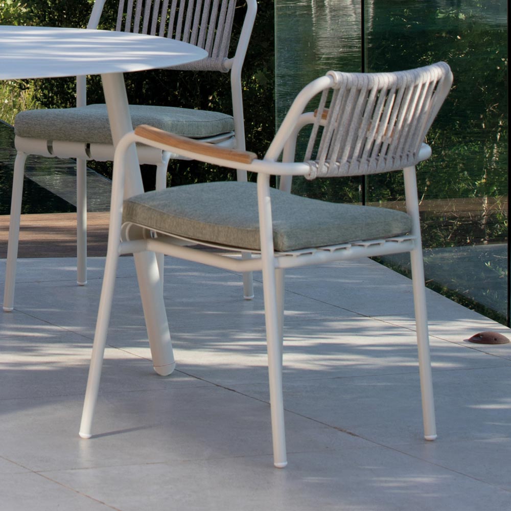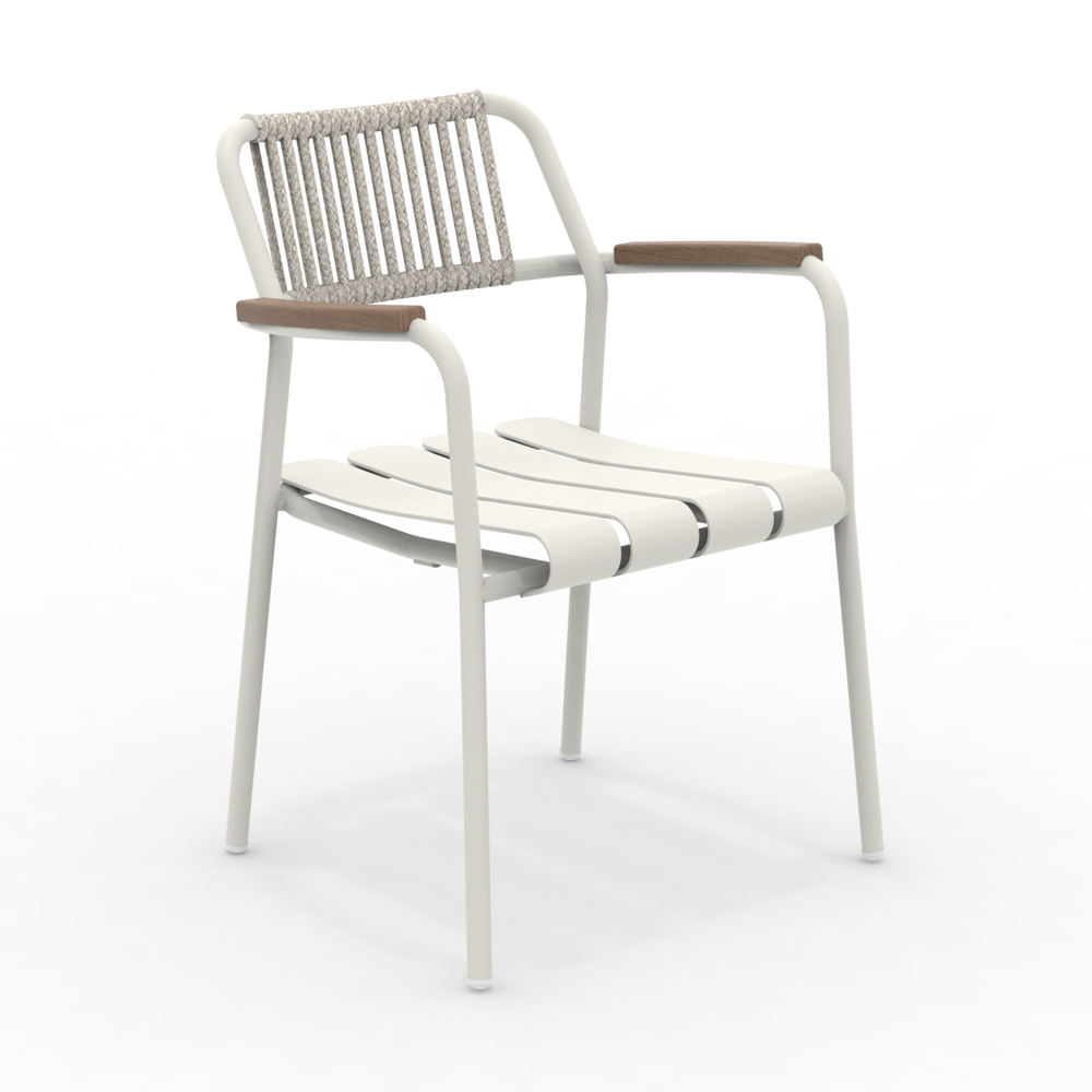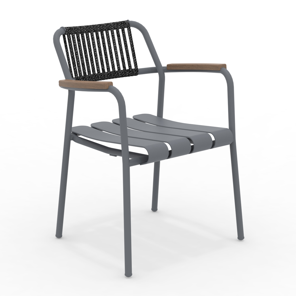 Su estructura ligera pero robusta está diseñada para ofrecer la máxima comodidad, con un asiento ergonómico y un respaldo moldeado de cuerda que garantizan un soporte cómodo y relajante. Las láminas de aluminio le dan un aspecto dinámico y moderno, mientras que el acabado añade un toque de elegancia y refinamiento.
