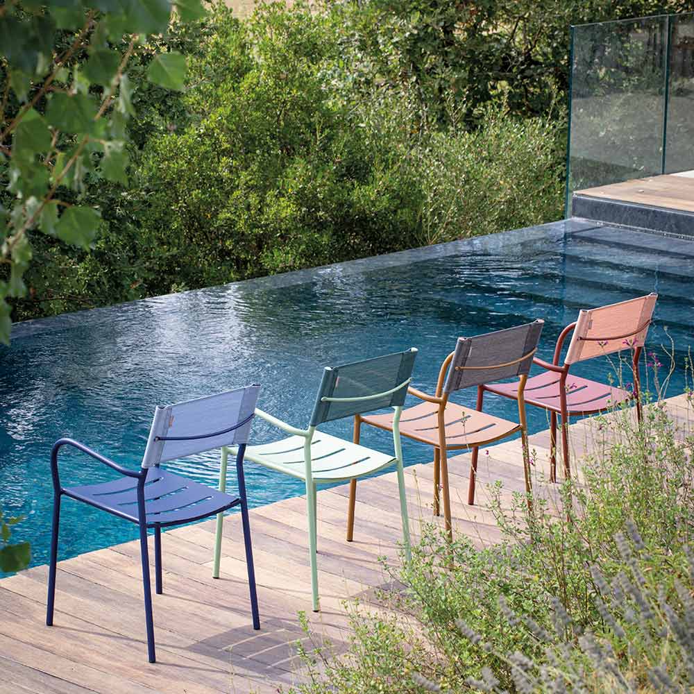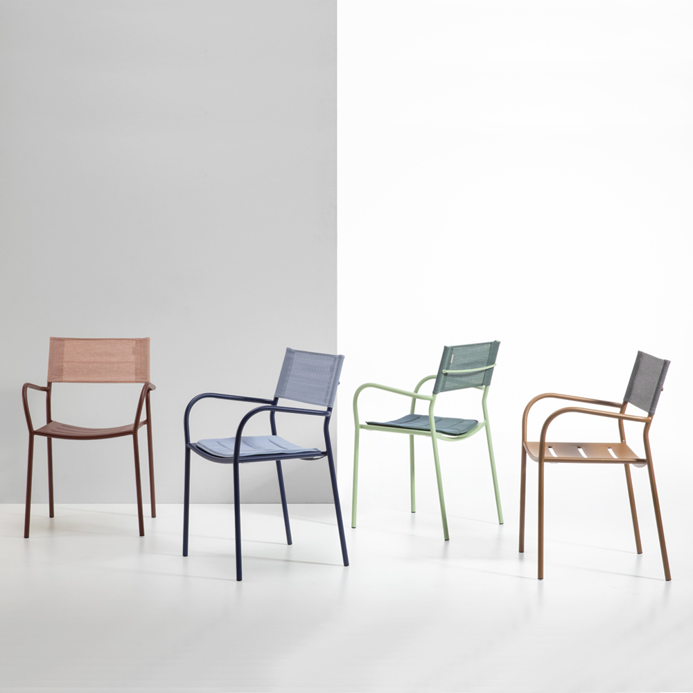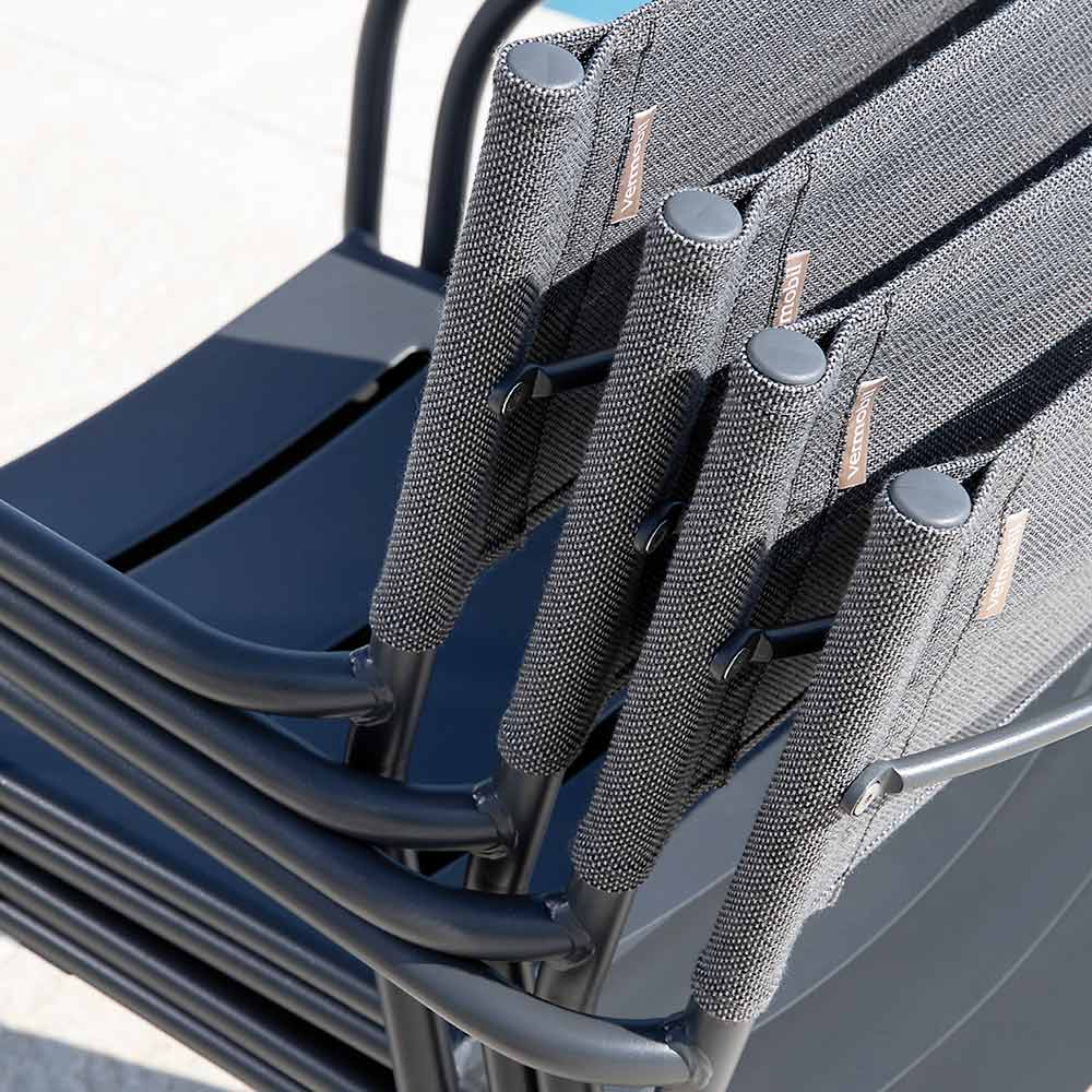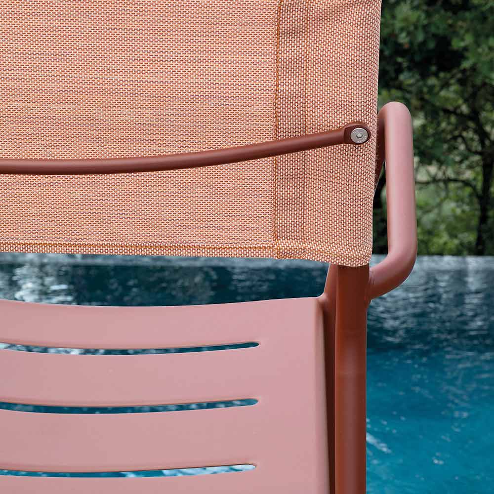 El asiento ergonómico de líneas sinuosas garantiza un excelente soporte y confort, mientras que el respaldo transpirable de batyline ofrece una comodidad superior, adaptándose perfectamente a la forma del cuerpo y favoreciendo la circulación del aire incluso en los días más calurosos. Los reposabrazos redondeados añaden un toque de refinamiento, haciendo la silla aún más cómoda para disfrutar de agradables momentos de relax al aire libre.