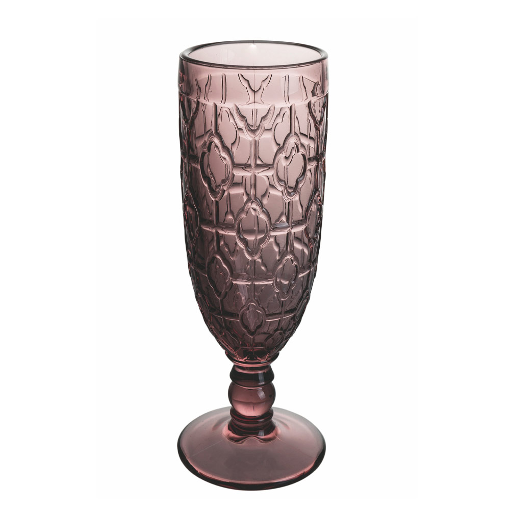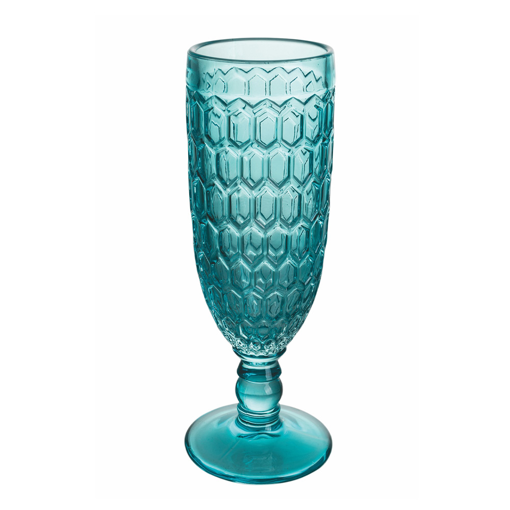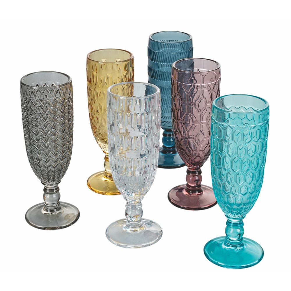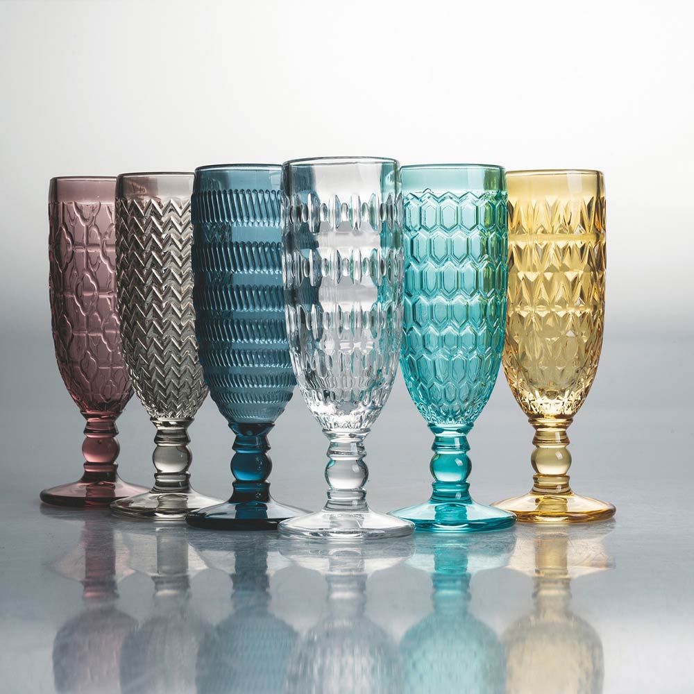Copas de vino flauta en cristal de colores y decoradas en relieve 12 piezas.
