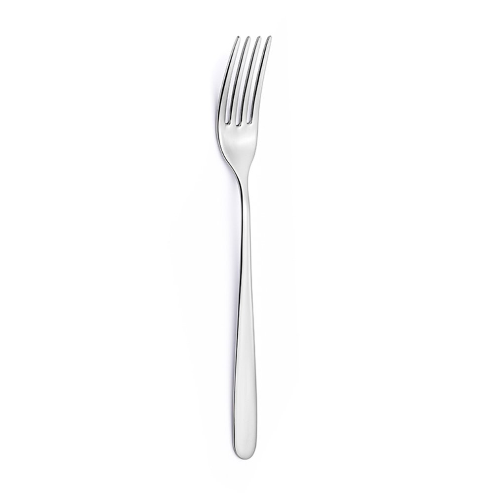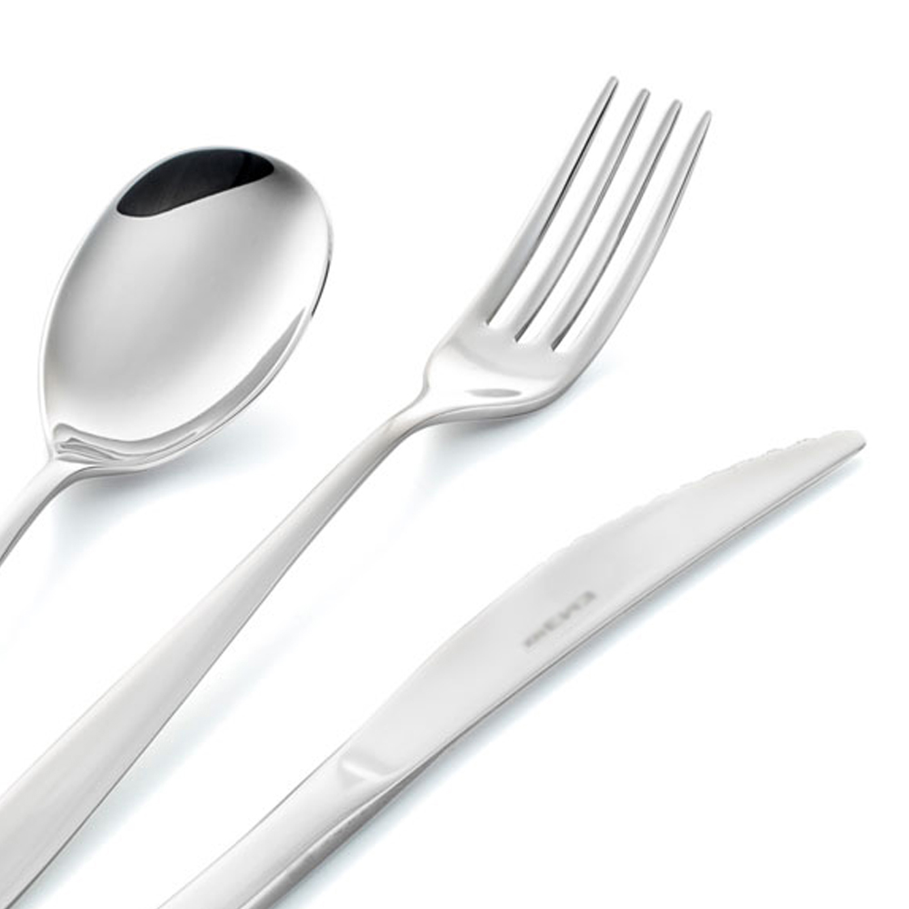Juego completo de cubiertos de acero inoxidable pulido con líneas suaves, 24 piezas made in Italy.