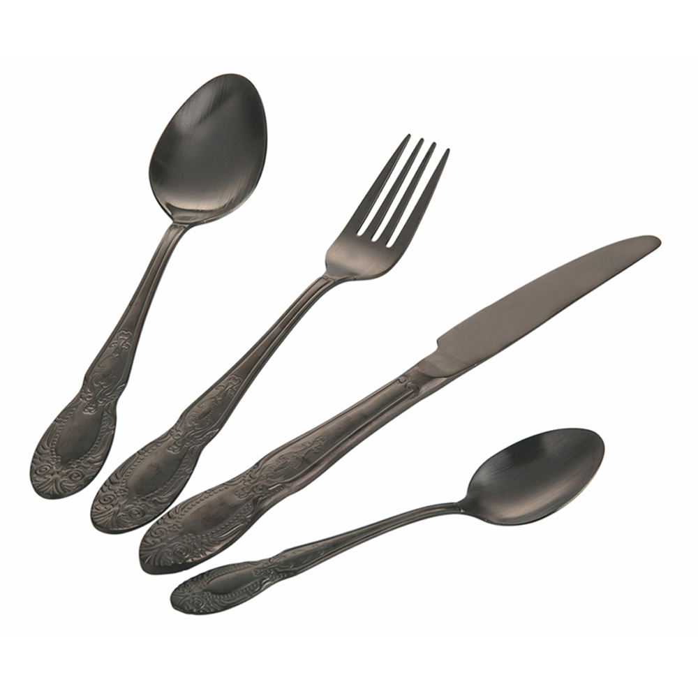 | Medidas | Horquilla: l. 2,5 x d. 0,2 x h. Cuchara de 20,5 cm: l. 4 x p. 0,2 x h. 20,5 cm Cuchillo: l. 2 x p. 0,2 x h. Cuchara de 24 cm: l. 3 x p. 0,2 x h. 14 cm |