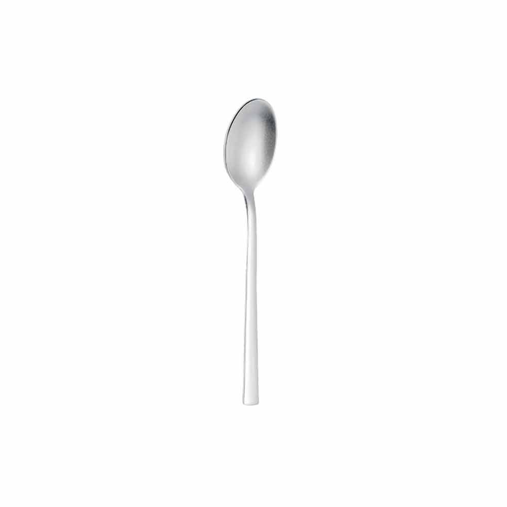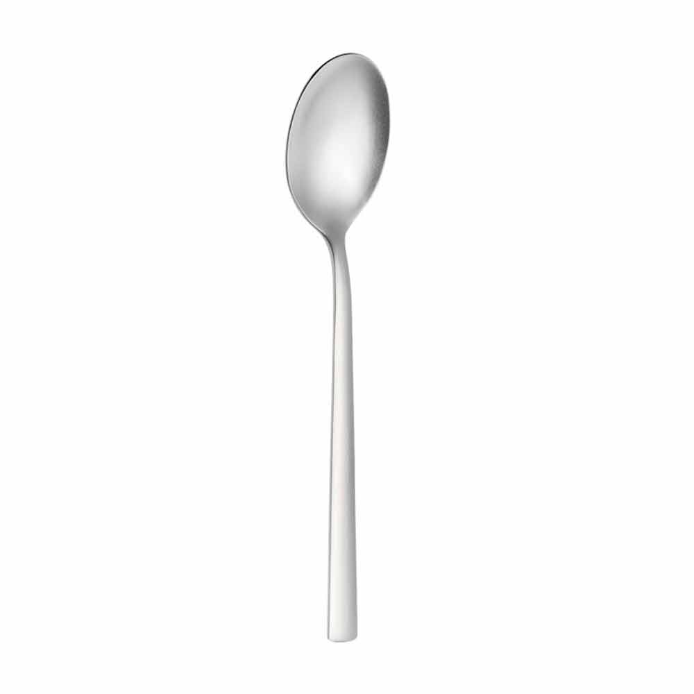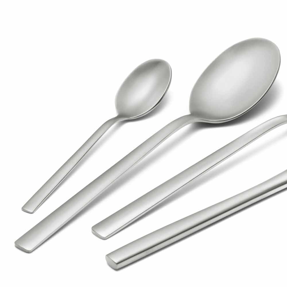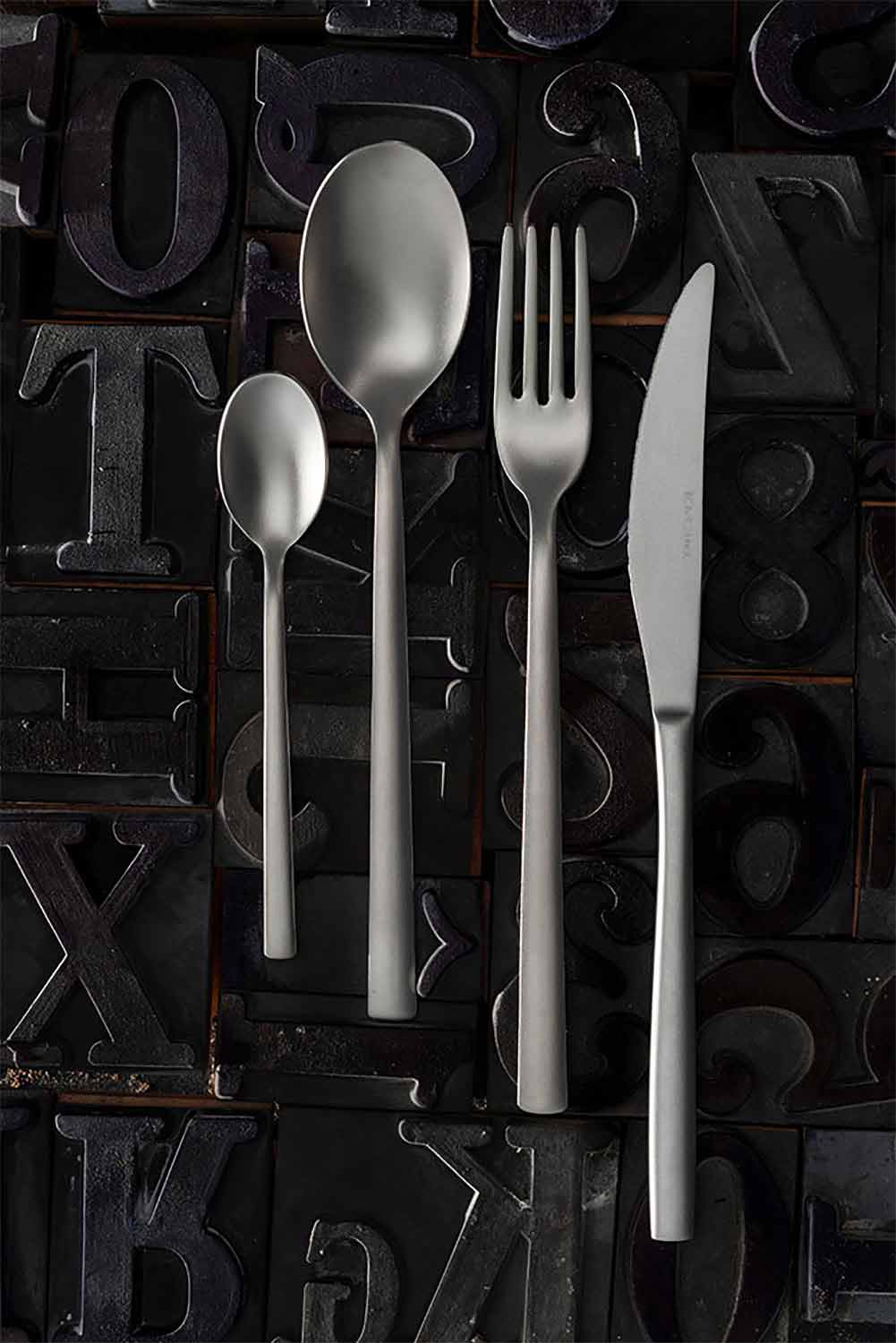El diseño se caracteriza por un estilo elegante , refinado y moderno: los tiradores lineales se caracterizan por su silueta pura y simple. El cuchillo monobloque tiene un mango sinuoso y ergonómico , mientras que el cuenco de la cuchara se diferencia por su forma ligeramente cuadrada , detalle peculiar del servicio.