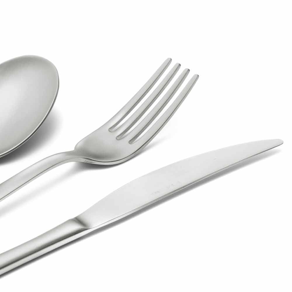 Cubertería completa en acero inoxidable pulido con chorro de arena, 24 piezas de diseño made in Italy.