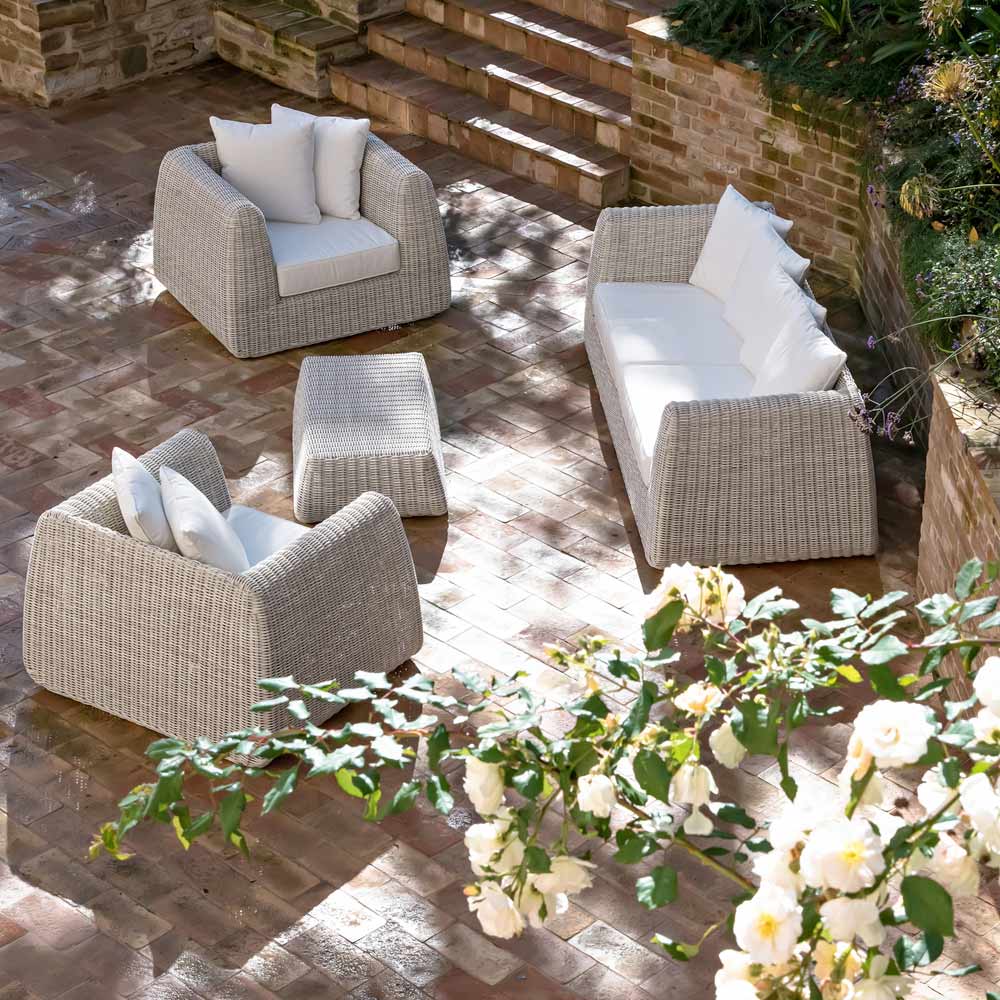 El diseño refinado , la altísima calidad de los materiales y sus formas sinuosas la hacen perfecta para decoración de interiores y exteriores. Gracias al uso de materiales especiales de alta calidad, este salón de exterior no teme las inclemencias del tiempo ni los cambios de temperatura gracias a la certificación de la fibra tejida.
