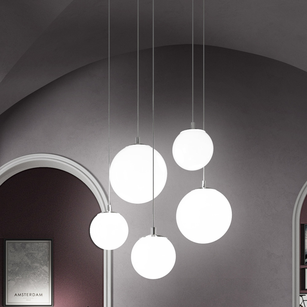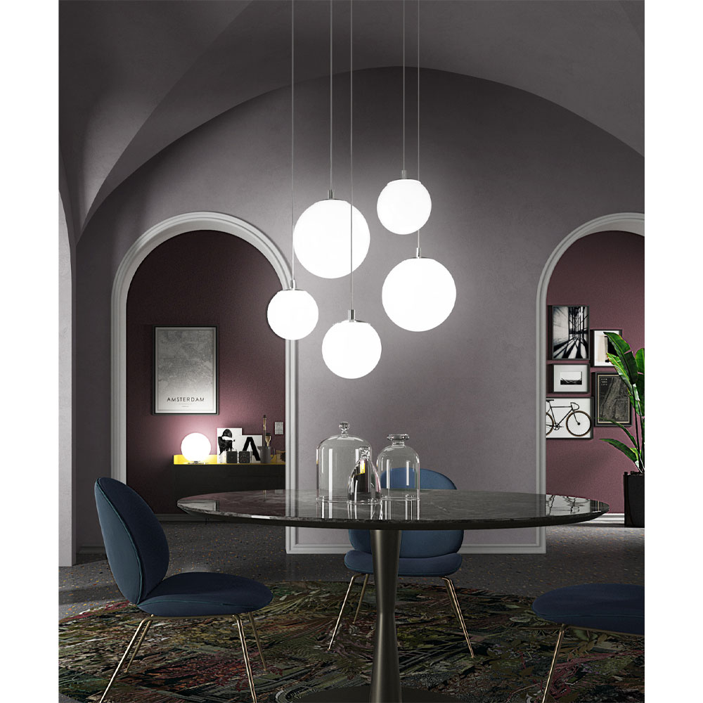 vidrio envuelto soplado a mano y singularizado por los maravillosos juegos de luz creados por la forma esférica del difusor y el particular procesamiento del vidrio.