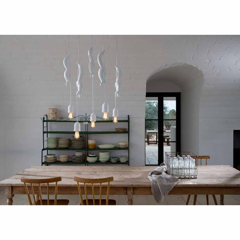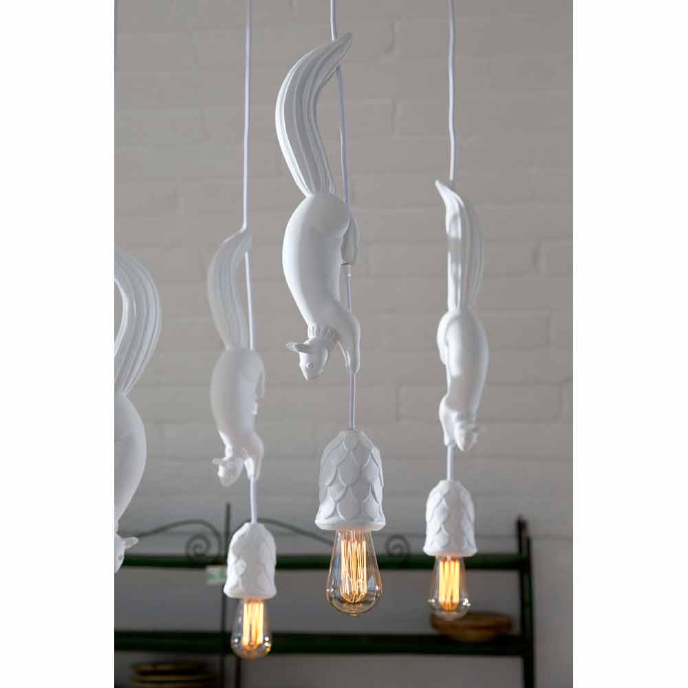 Esta original y singular lámpara de suspensión tiene un diseño original y moderno con la representación de la bombilla que se convierte en una bellota lista para ser recogida por el animal que desciende por el alambre. Es un complemento de alto impacto, para ambientes divertidos y elegantes, como los frutos de un sotobosque luminoso que quieren resaltar la autenticidad y las mil tonalidades que caracterizan la personalidad de cada uno, a través de la representación de elementos luminosos con un diseño único e innovador. .