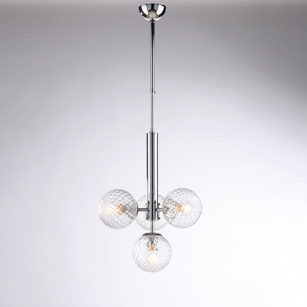 Elegante y contemporánea, esta lámpara colgante de hierro artesanal destaca por su diseño equilibrado y refinado. La estructura vertical central sostiene cuatro difusores esféricos de vidrio , creando una composición de iluminación armoniosa que difunde la luz de forma uniforme y envolvente.