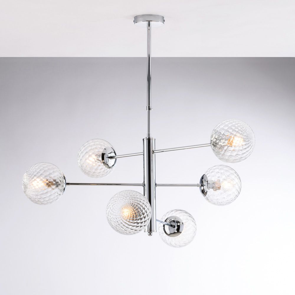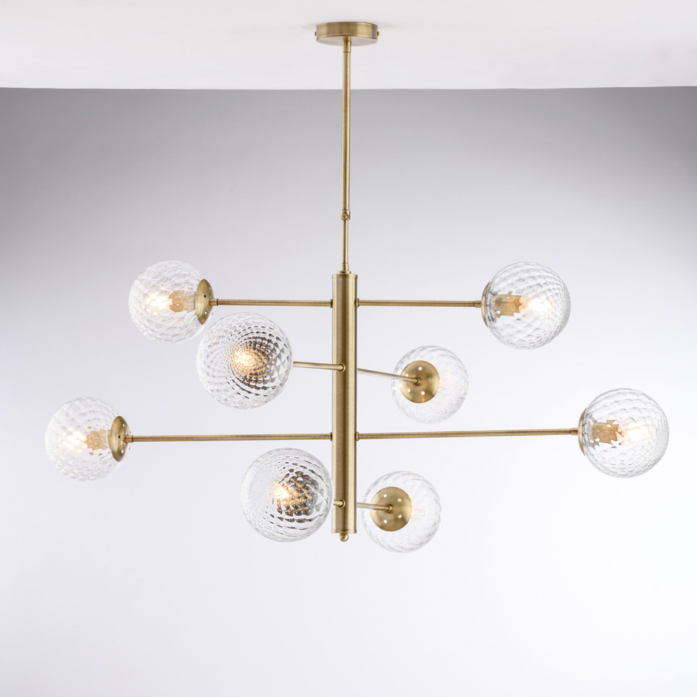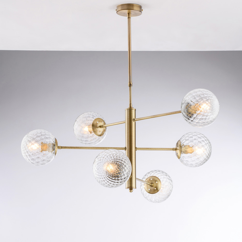 Elegante y contemporánea, esta lámpara colgante de hierro artesanal destaca por su equilibrada composición geométrica. Los brazos horizontales sostienen difusores esféricos de vidrio, creando un refinado juego de simetrías que proyecta una luz difusa y armoniosa.