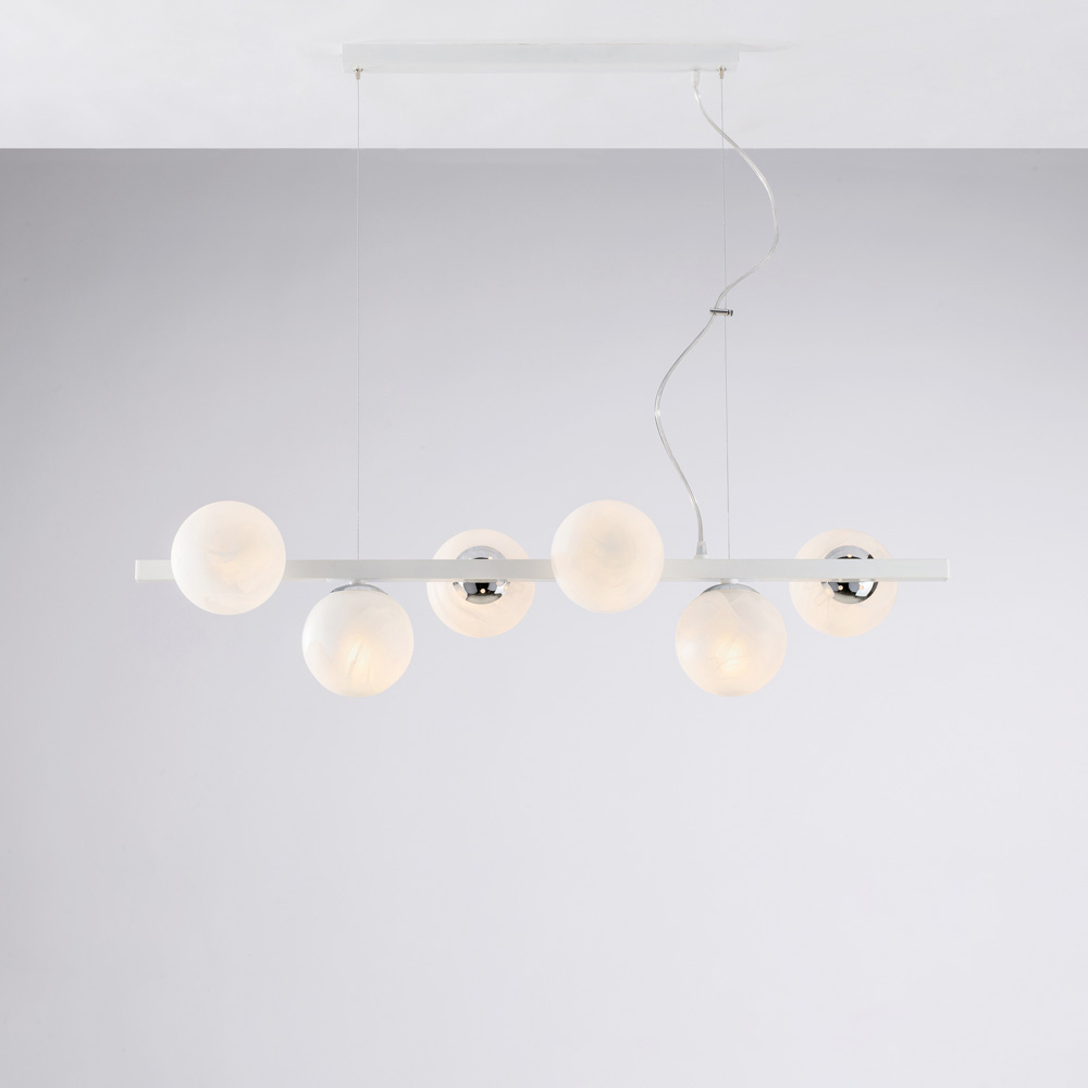 Disponible en refinados acabados blanco/cromo o negro/bronce , esta lámpara colgante se integra de forma natural en salones , comedores , islas de cocina , espacios abiertos y ambientes de diseño . Una lámpara que refleja la calidad de la artesanía italiana y la atención al detalle.