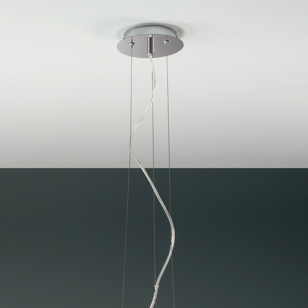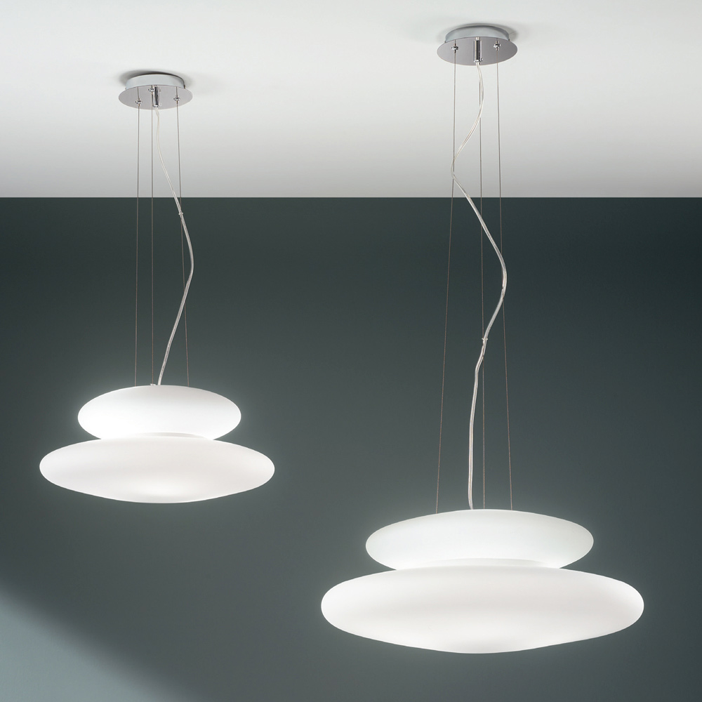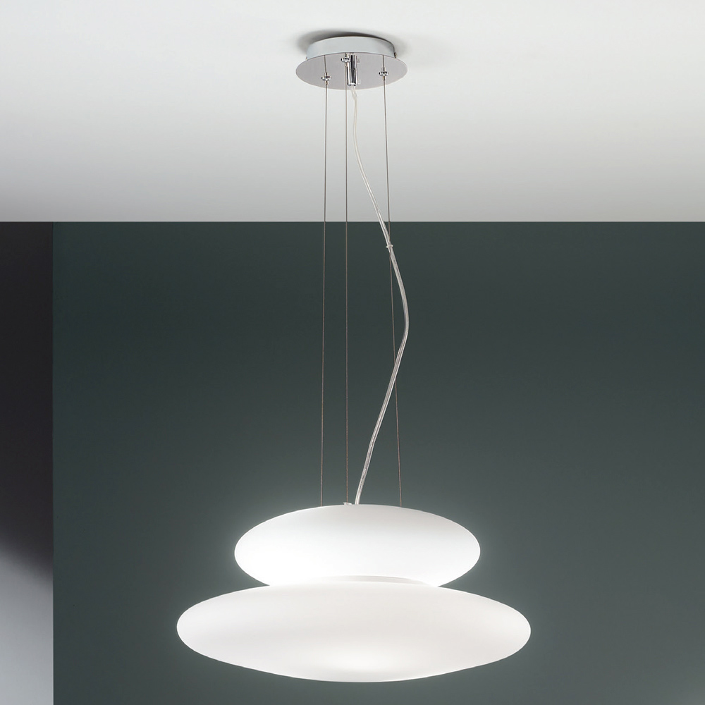 Lámpara de suspensión con estructura de metal cromadoy difusor de vidrio soplado blanco grabado al ácido completo con cables regulables en longitud. Ideal para quienes buscan un estilo innovador y vanguardista , este accesorio de decoración demuestra un alma delicada y elegante que es una solución perfecta para espacios domésticos con una estética contemporánea. Formado por dos discos supervivientes en vidrio soplado, logra conquistar la atención convirtiéndose en el verdadero protagonista de la estancia y al mismo tiempo asegurando una iluminación óptima y de alta calidad .