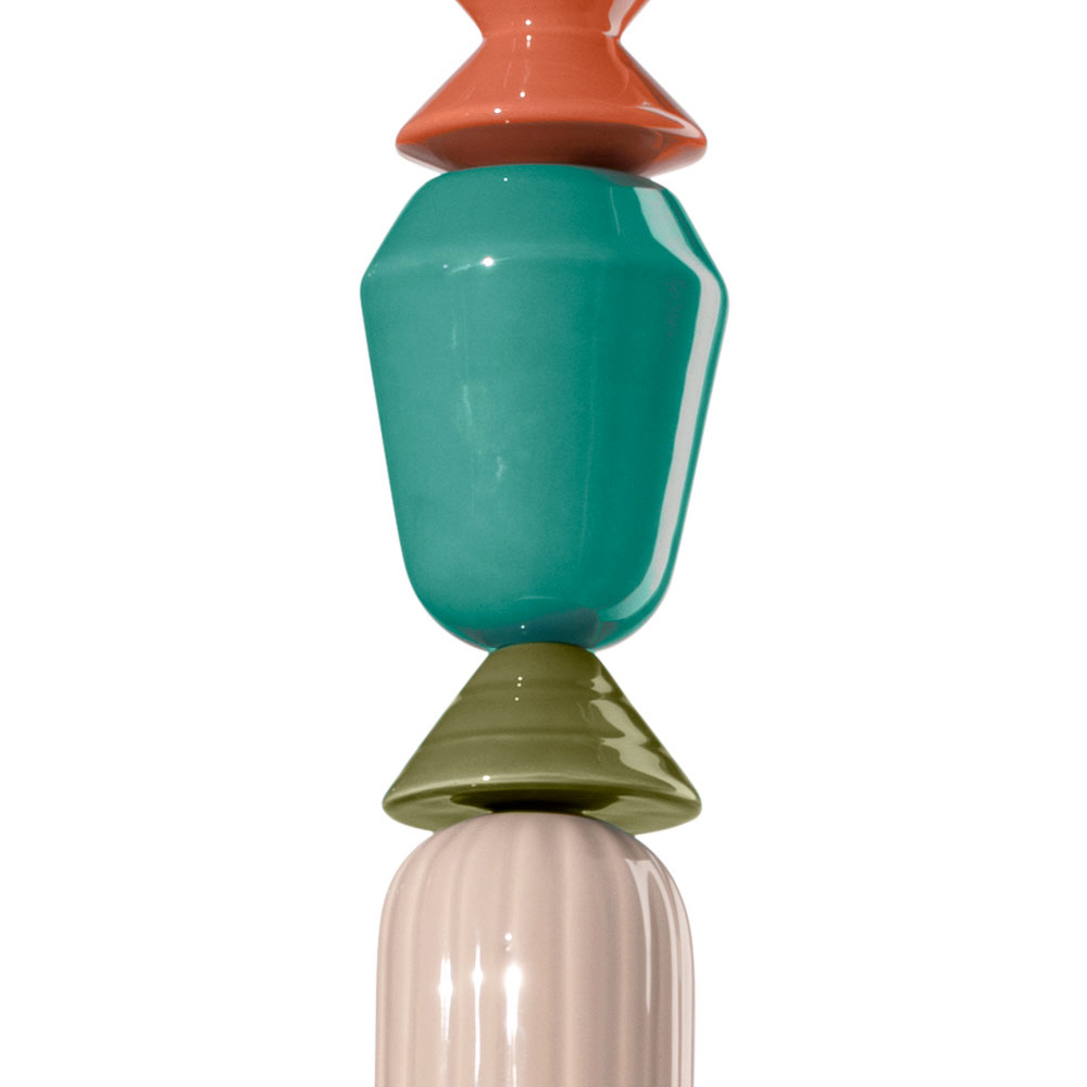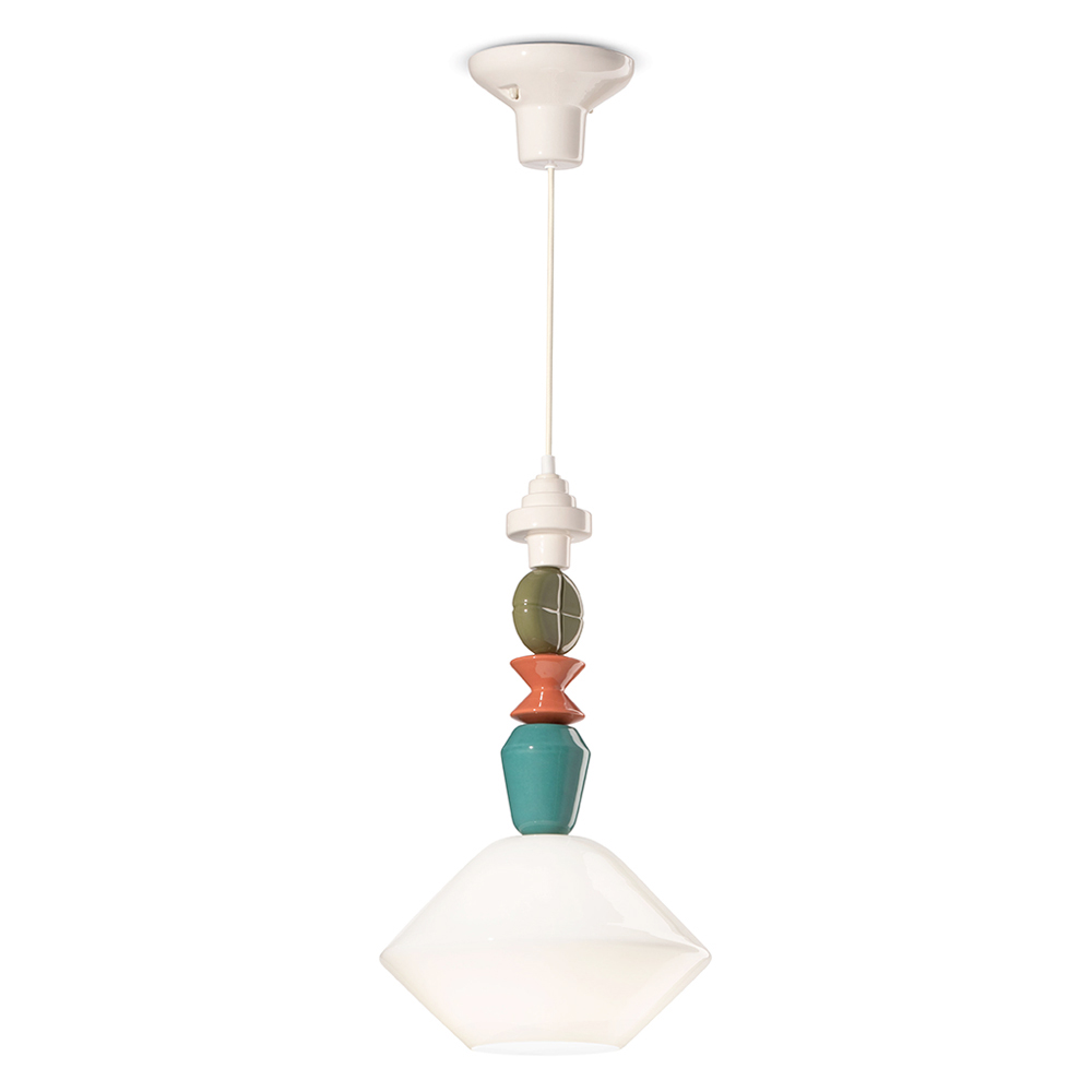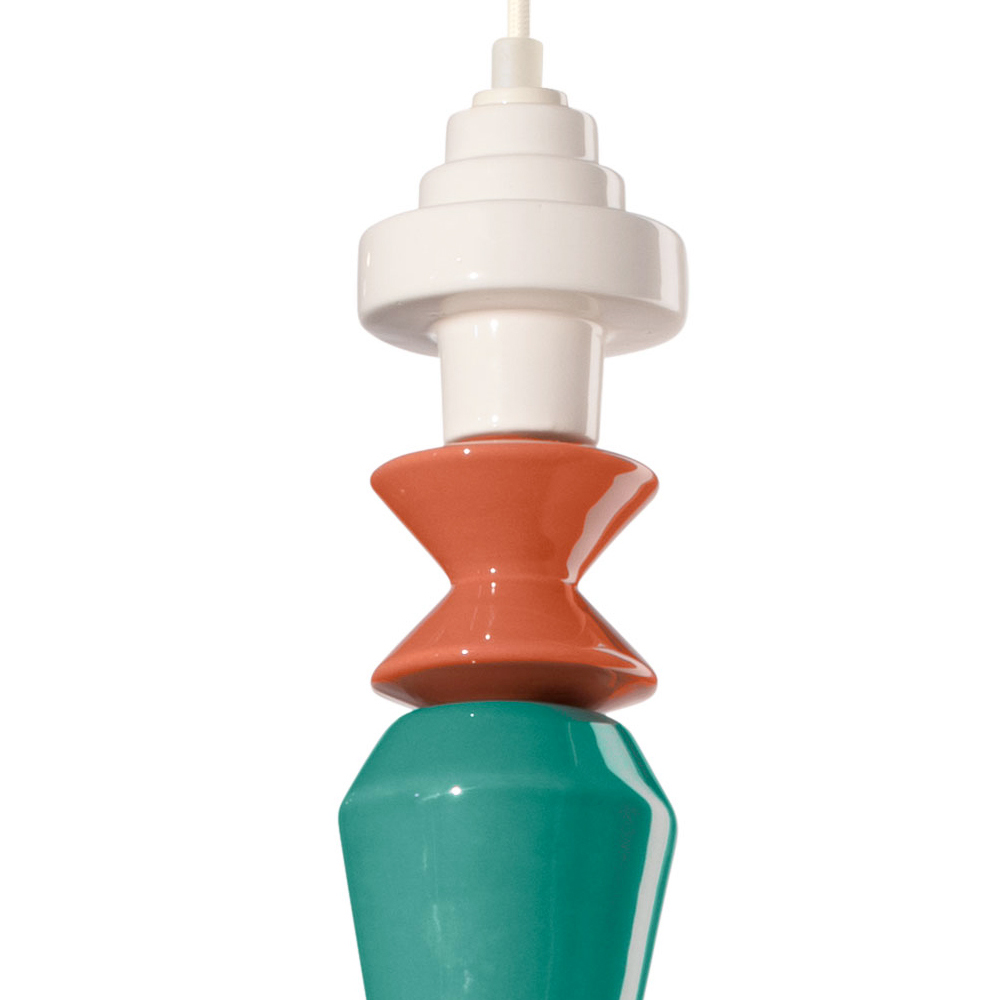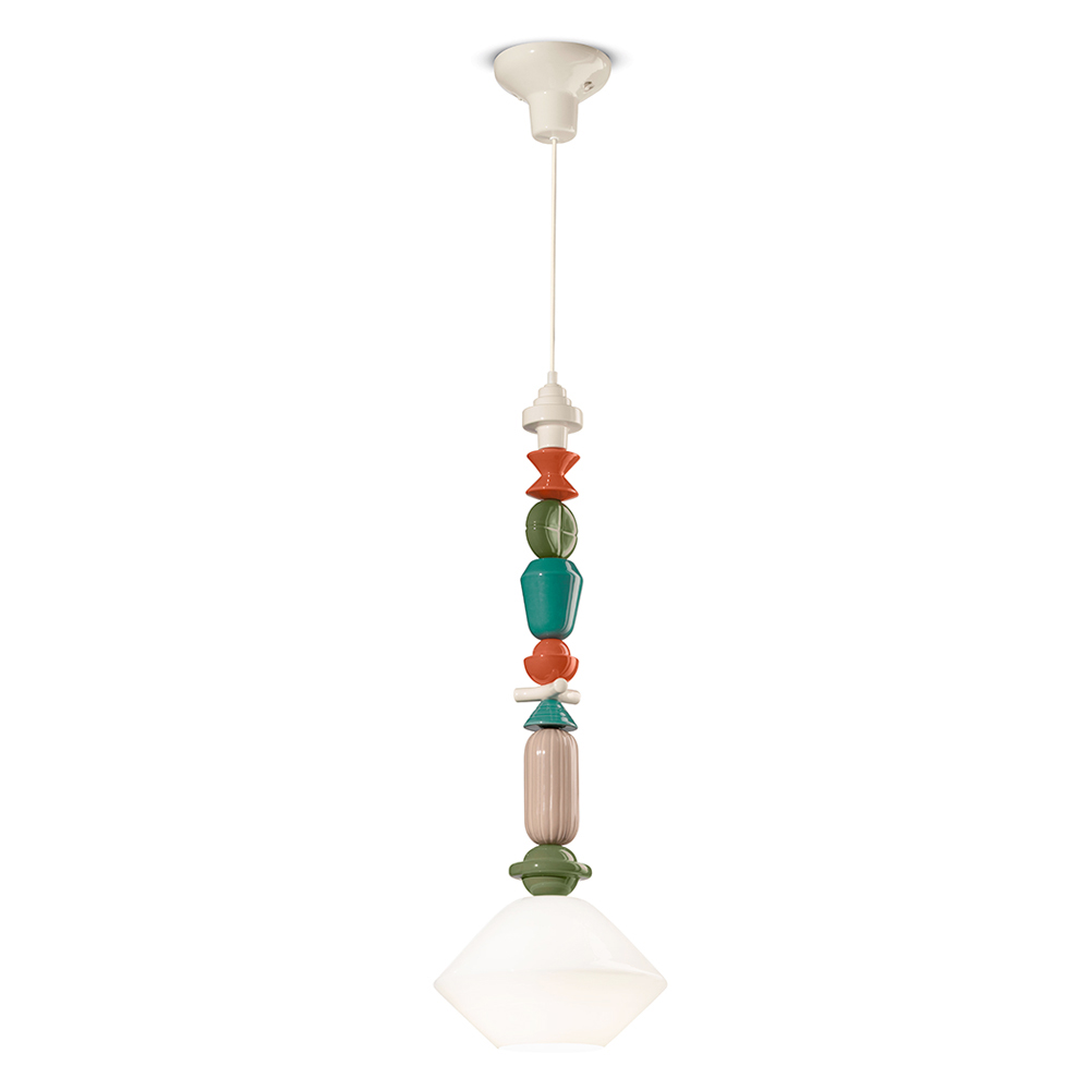 Esta lámpara colgante es una obra de arte luminosa que combina la calidez de la cerámica con la transparencia del vidrio. Con sus formas geométricas y su secuencia de elementos coloreados , este mueble es como un tótem de luz y color que aporta personalidad y vivacidad a cualquier estancia.