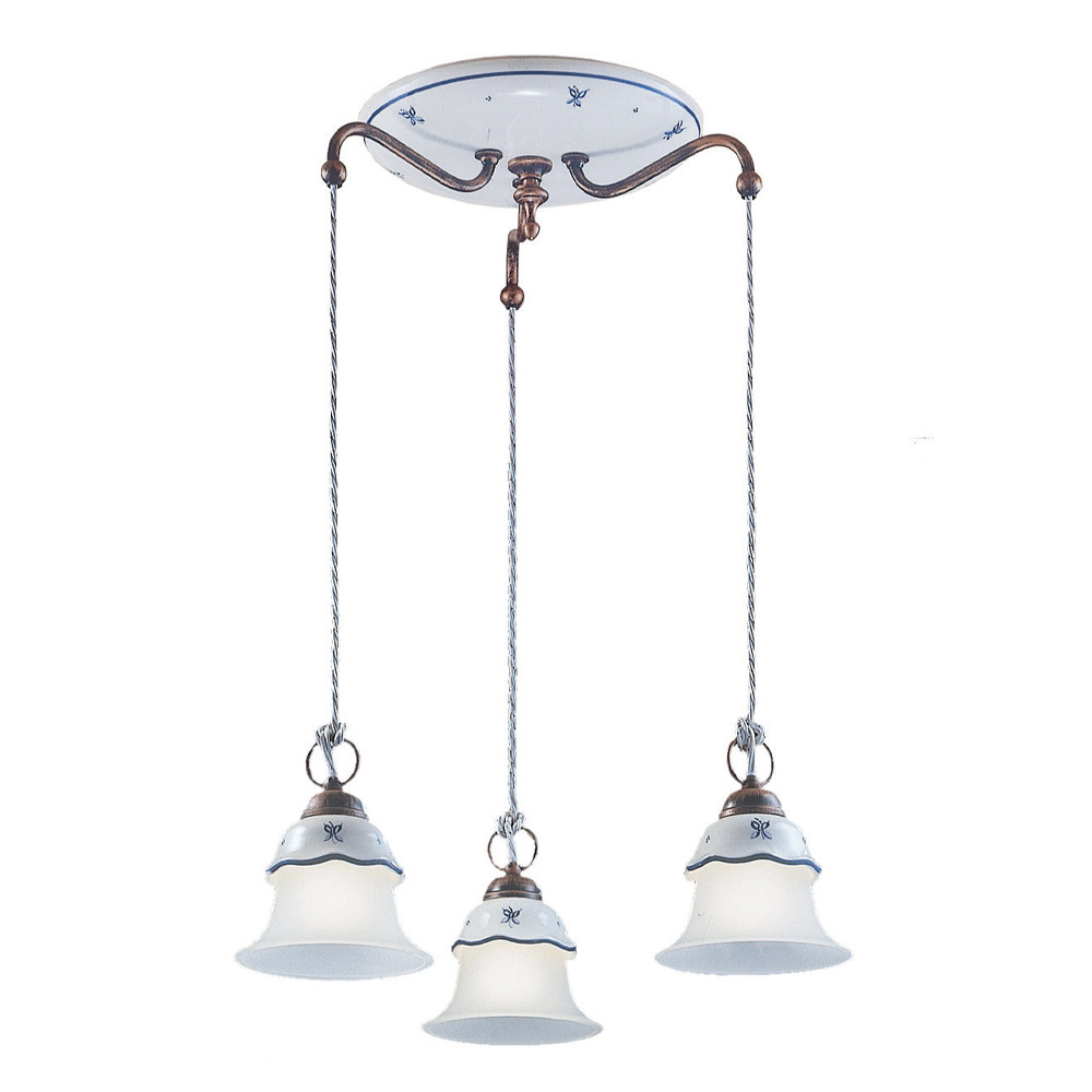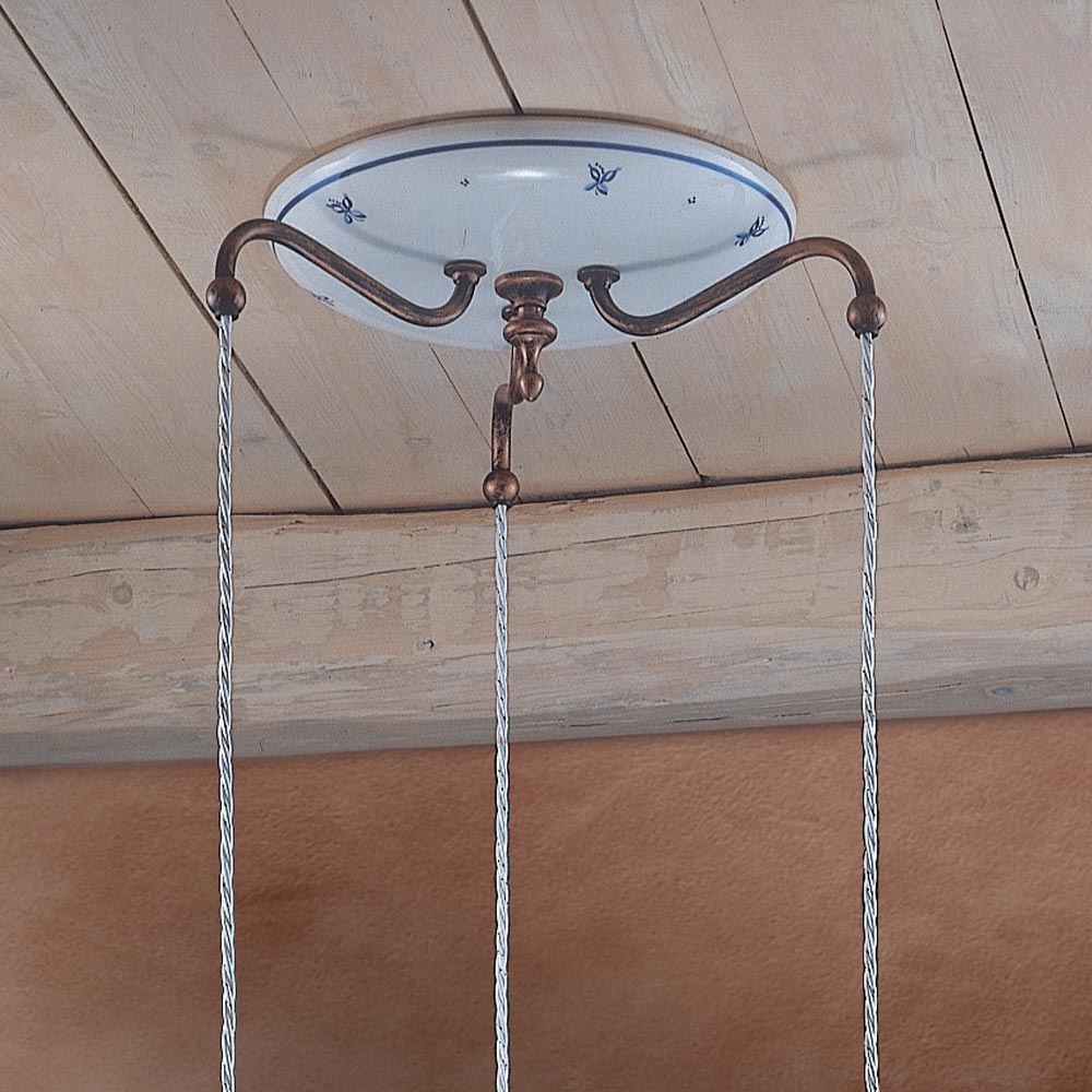 Lámpara de suspensión de 3 luces en hierro, cerámica decorada a mano y cristal al ácido fabricada en Italia por Ferroluce.