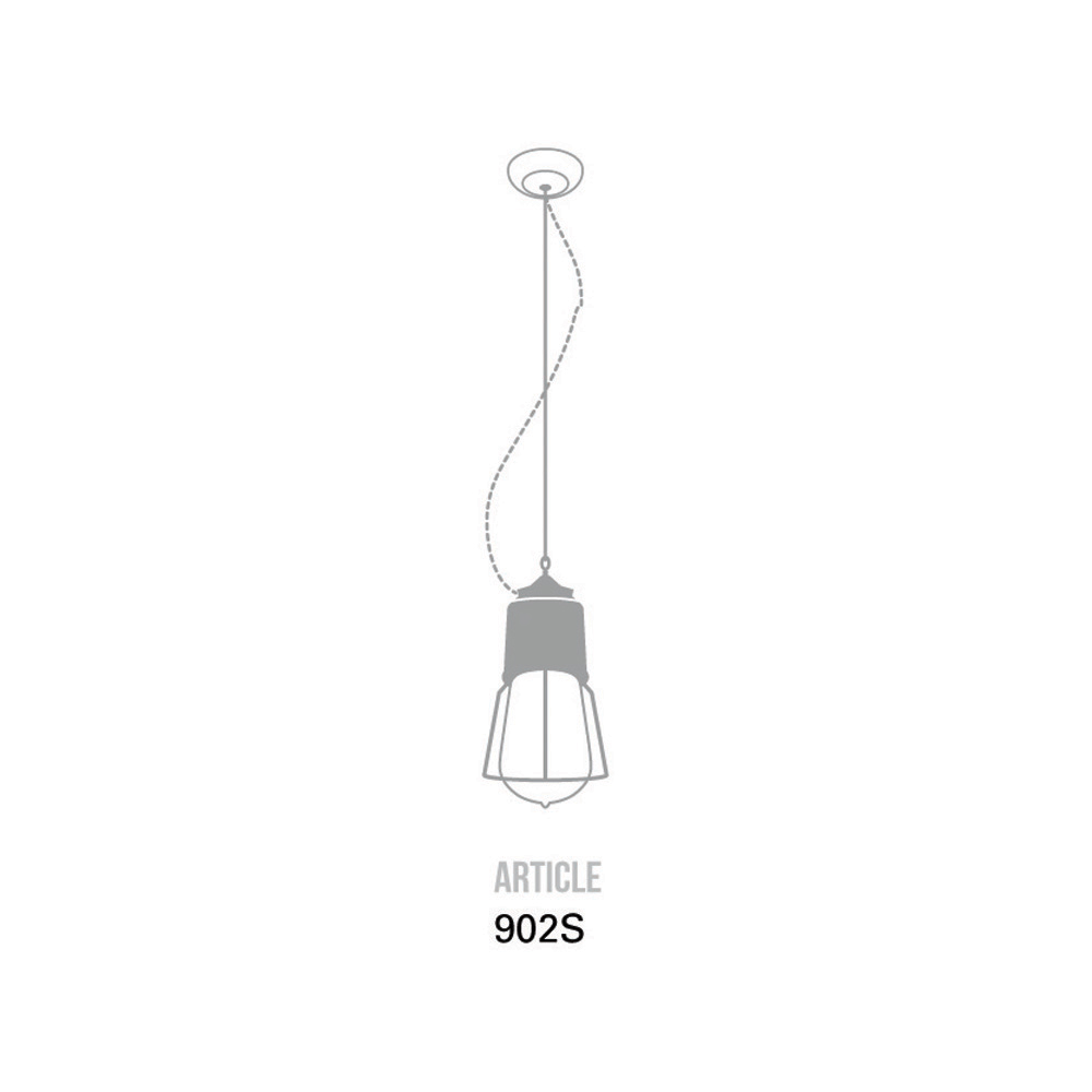 Lámpara colgante individual con rosetón. Dimensiones : Base Ø12 Jaula Ø16 Vidrio Ø10 H.150 Bombillas : 1 x E27 max 70W IP 44 - no incluidas