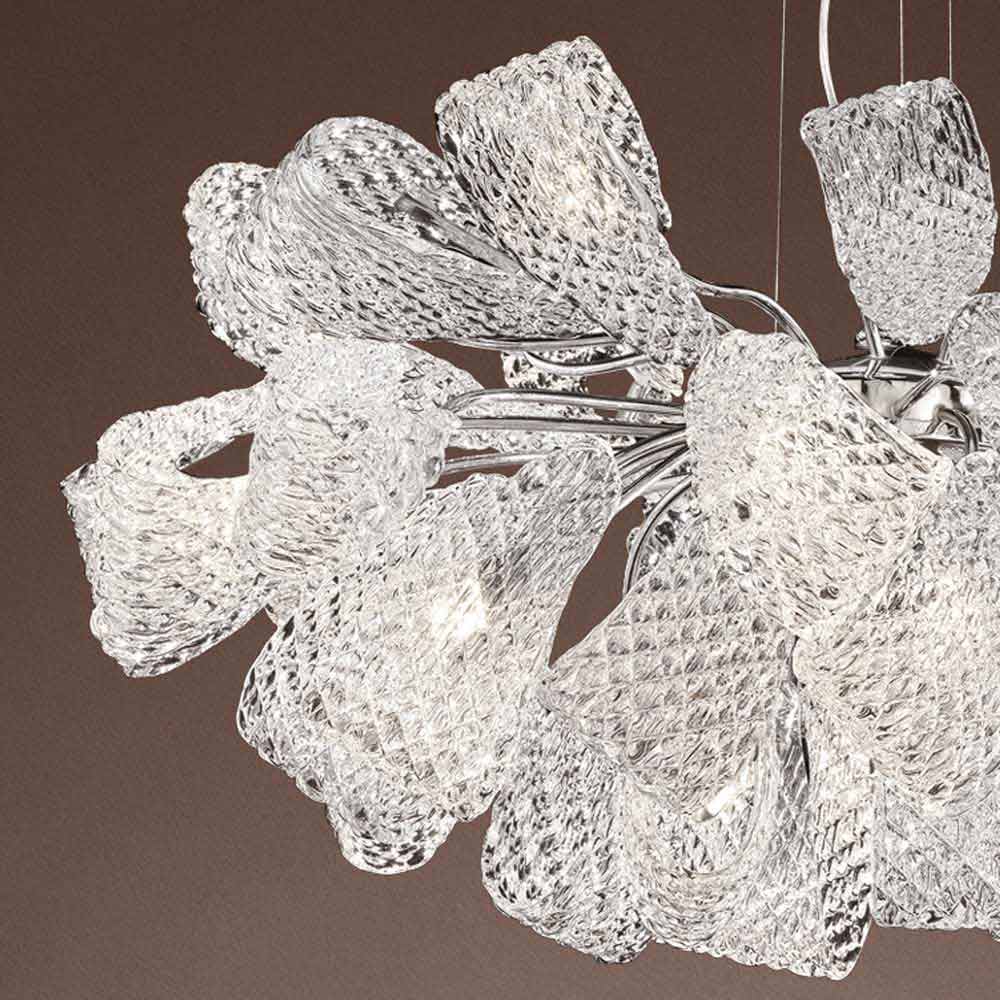 Imponente y refinada lámpara de araña de 21 luces hecha a mano en Italia en vidrio Venecia con acabado cristal con detalles e inserciones en metal cromado pulido . Del encuentro entre líneas curvas y formas voluminosas , nace un accesorio de iluminación extremadamente refinado , caracterizado por grandes arcos de vidrio que aumentan su valor y enriquecen su estética. En ellos encontramos un patrón de rombos obtenido al imprimir la textura en el vidrio en caliente y así dejar que la luz se deslice entre las ranuras, reflejándose en los elementos metálicos para un espectacular juego de reflejos .