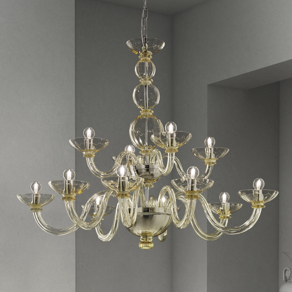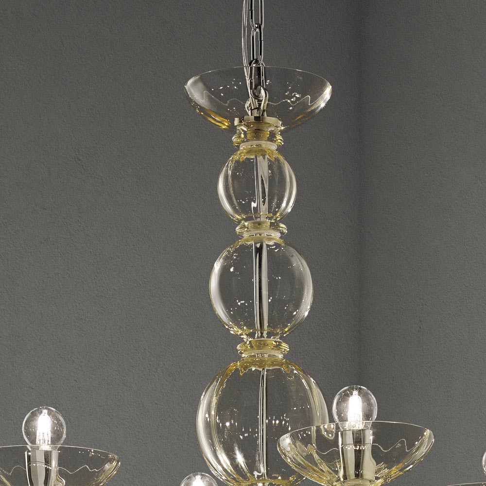 Araña de 12 luces en cristal veneciano trabajado a mano acabado topacio con detalles en metal cromado pulido . Un mueble con una presencia sorprendente e icónica caracterizado por una línea suave y delicada y curvas refinadas que se adaptan perfectamente a ambientes clásicos pero al mismo tiempo también a espacios con un estilo contemporáneo. El elemento de tradición está marcado por sus maravillosos componentes en vidrio soplado completamente hecho a mano que se transforma para actualizarse gracias a los colores de moda. Sus formas envolventes lo convierten en un elemento ideal para ocupar cualquier ambiente, tanto doméstico como contract, con clase y dinamismo .