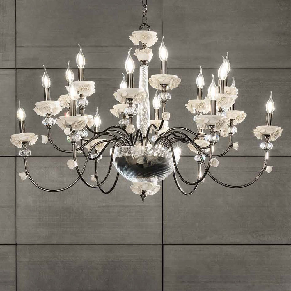 Araña de 18 luces en porcelana y vidrio soplado, lujo made in Italy.