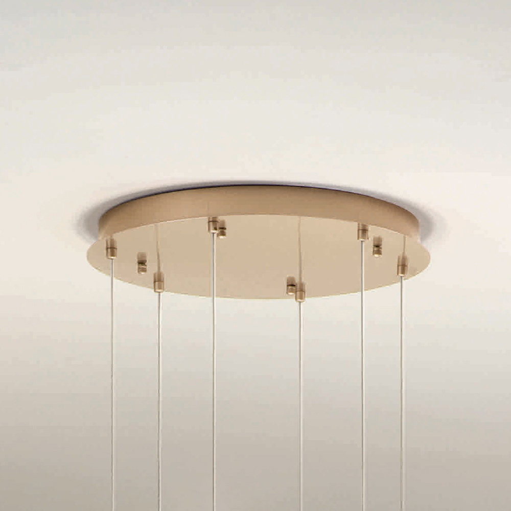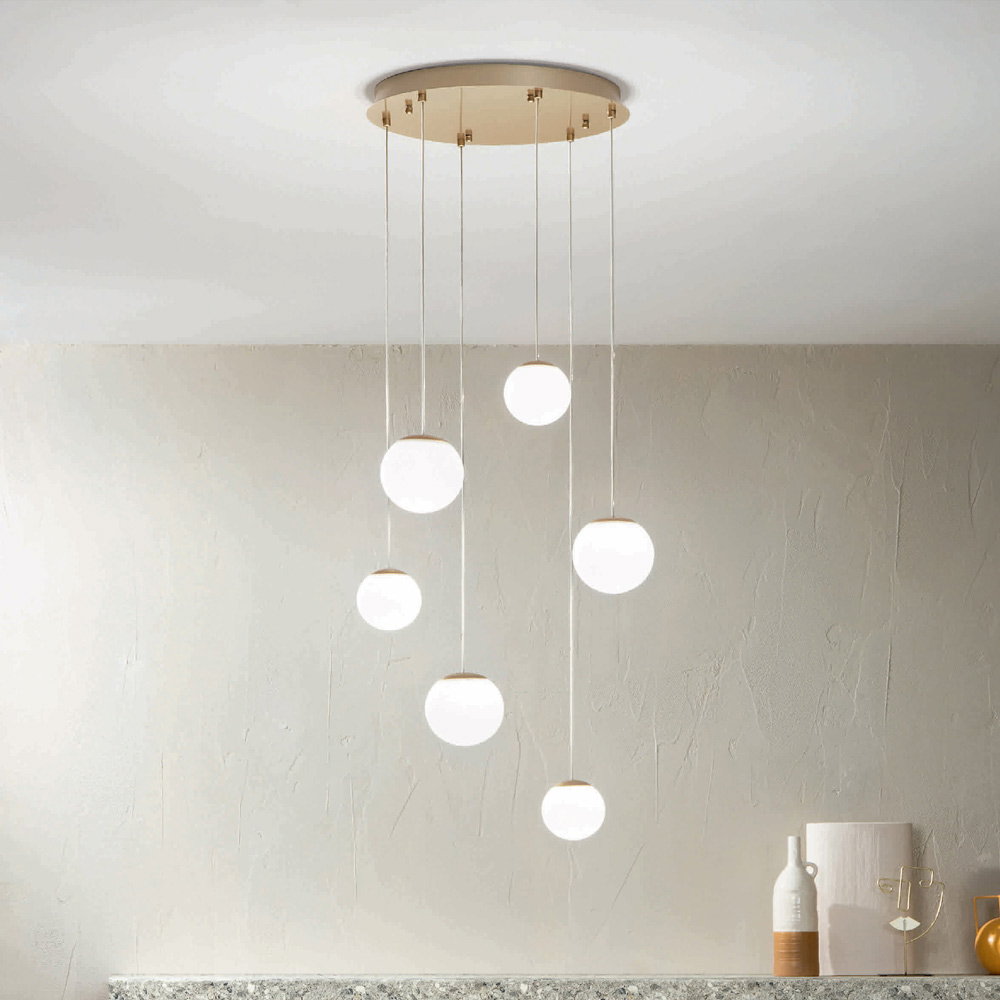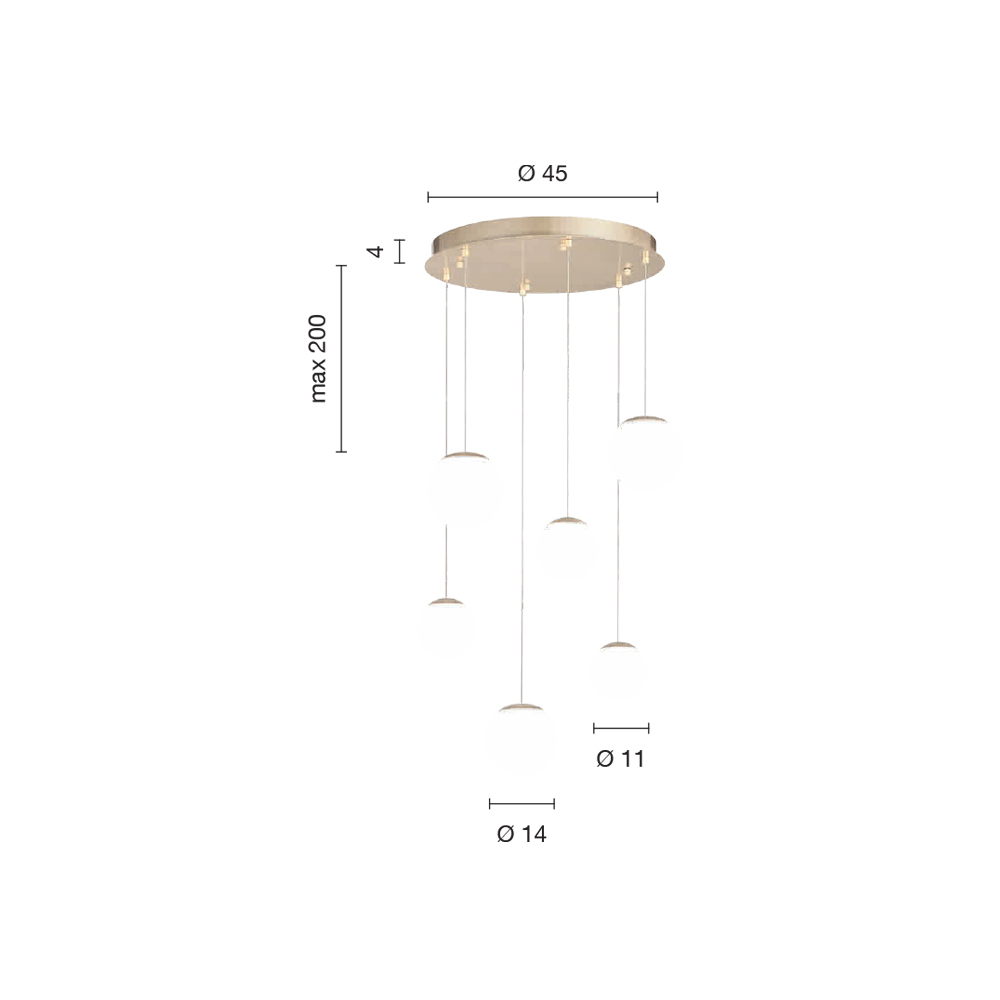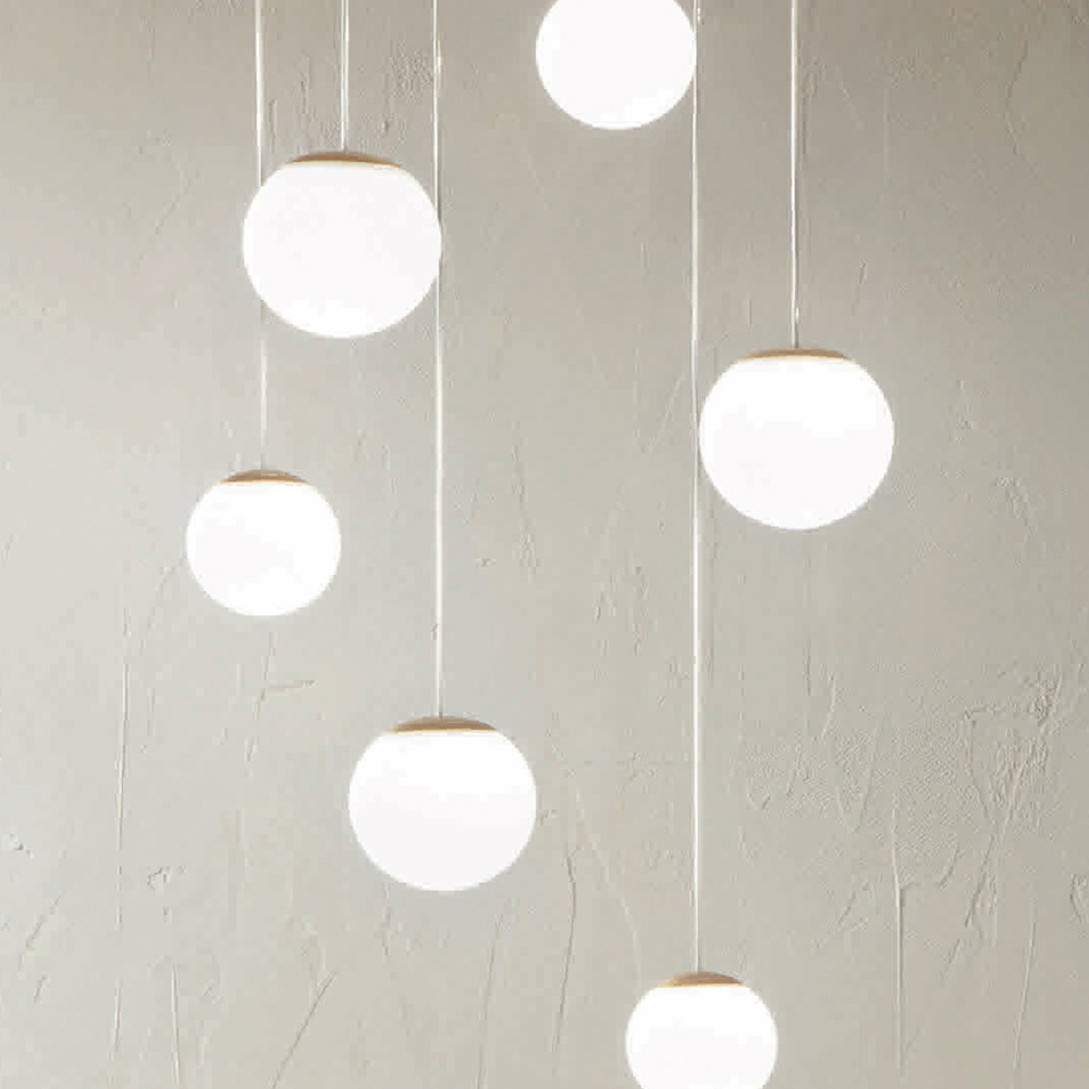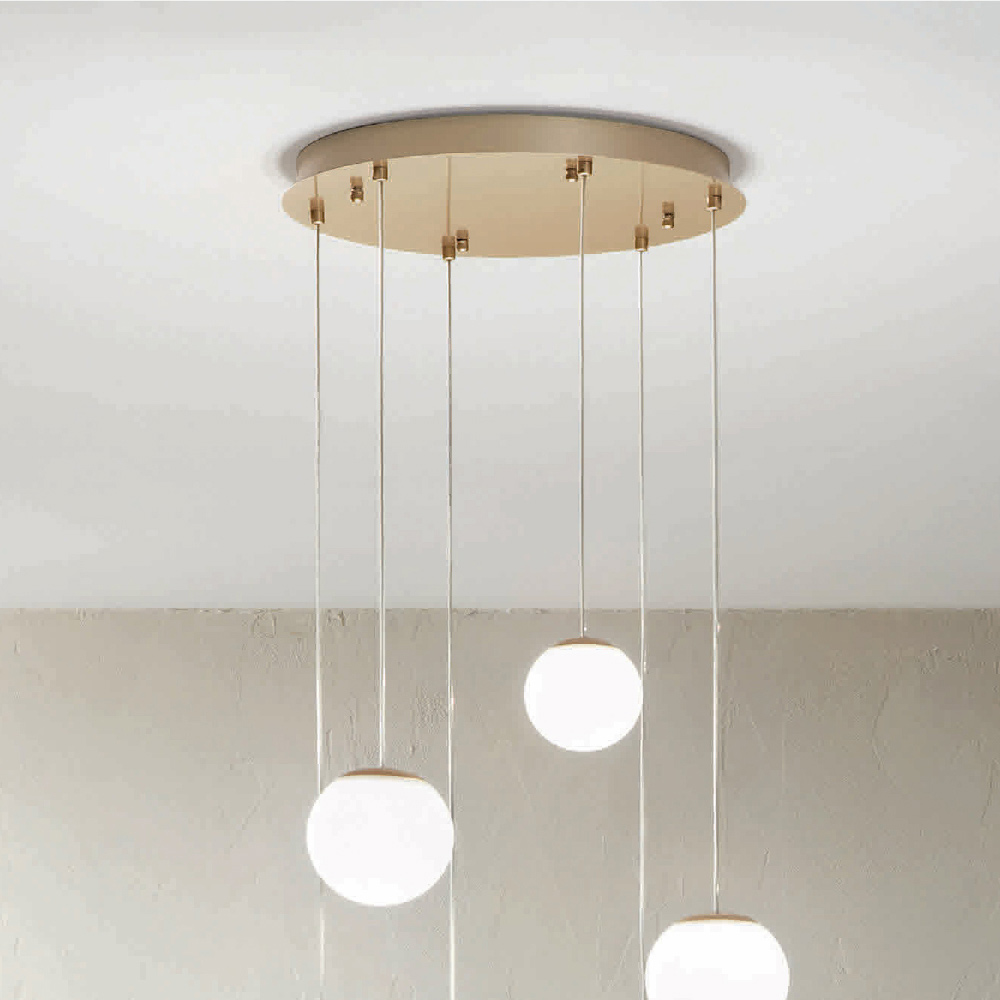 Araña íntegramente fabricada en Italia realizada en metal pintado acabado dorado y 6 luces LED con pantalla opcional en cristal coloreado que se puede quitar desenroscando la esfera de cristal. Este producto tiene como objetivo realzar la tradición a través de un enfoque contemporáneo donde el estilo, la clase y la innovación se fusionan para crear nuevas fórmulas de diseño para amueblar e iluminar cualquier ambiente con gusto y carácter. Los puntos fuertes son la peculiaridad de las formas , la calidad de los materiales y la singularidad de la fuente de luz .