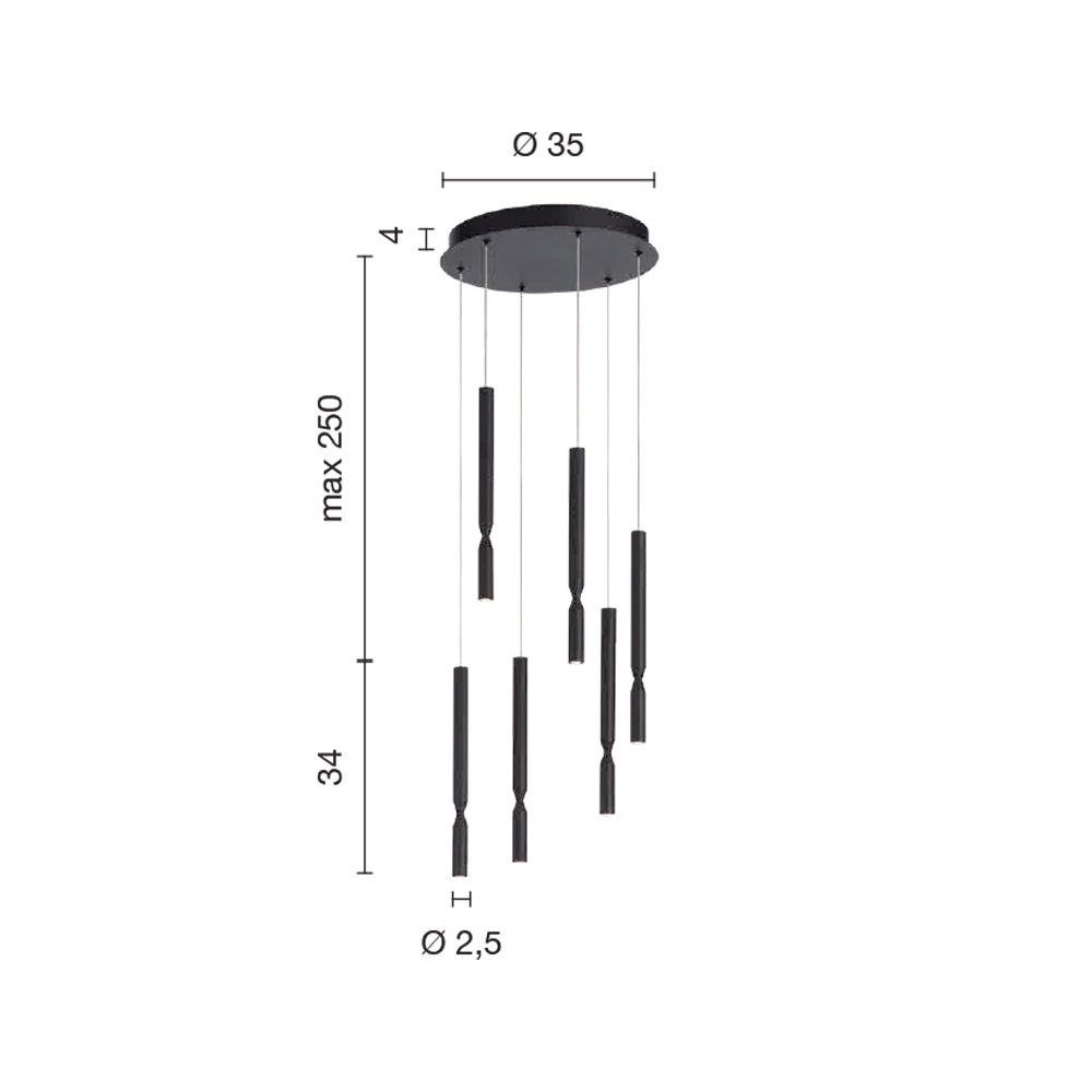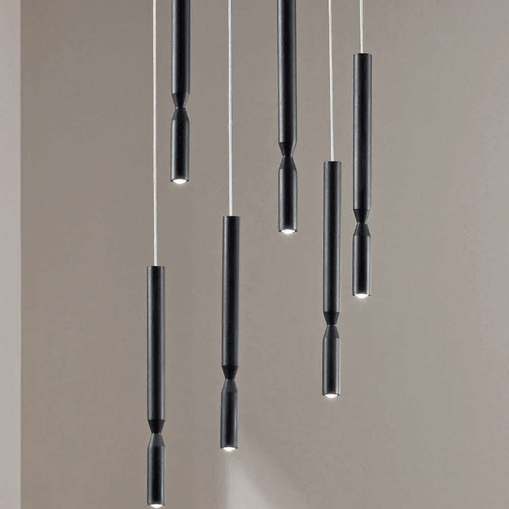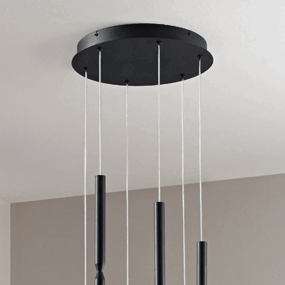 Lámpara de araña íntegramente fabricada en Italia de metal pintado de negro y 6 luces LED regulables con cables de longitud ajustable .