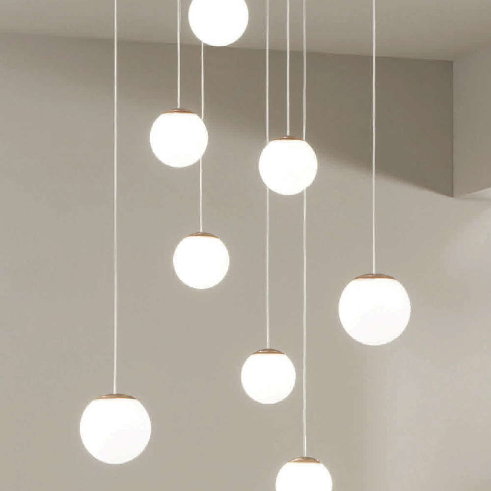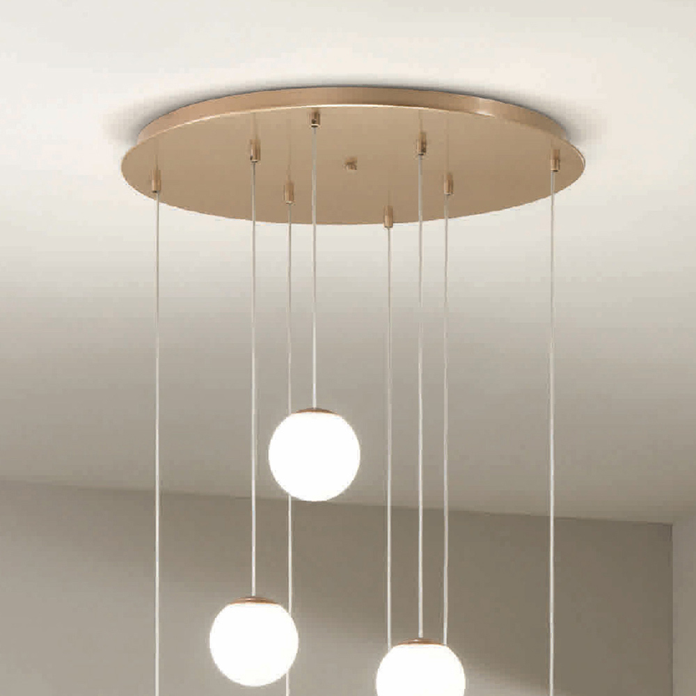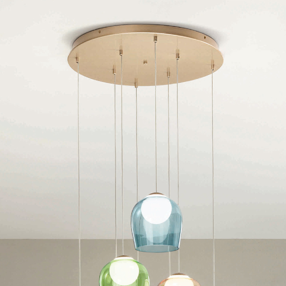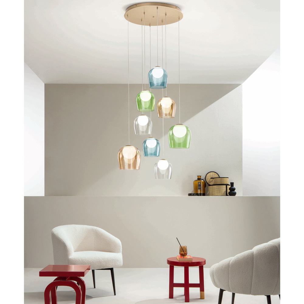 Araña íntegramente fabricada en Italia realizada en metal pintado acabado dorado y 8 luces LED con pantalla opcional en cristal coloreado que se puede quitar desenroscando la esfera de cristal. Este producto tiene como objetivo realzar la tradición a través de un enfoque contemporáneo donde el estilo, la clase y la innovación se fusionan para crear nuevas fórmulas de diseño para amueblar e iluminar cualquier ambiente con gusto y carácter. Los puntos fuertes son la peculiaridad de las formas , la calidad de los materiales y la singularidad de la fuente de luz .