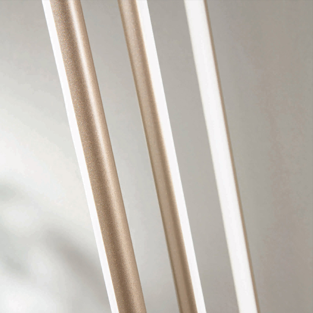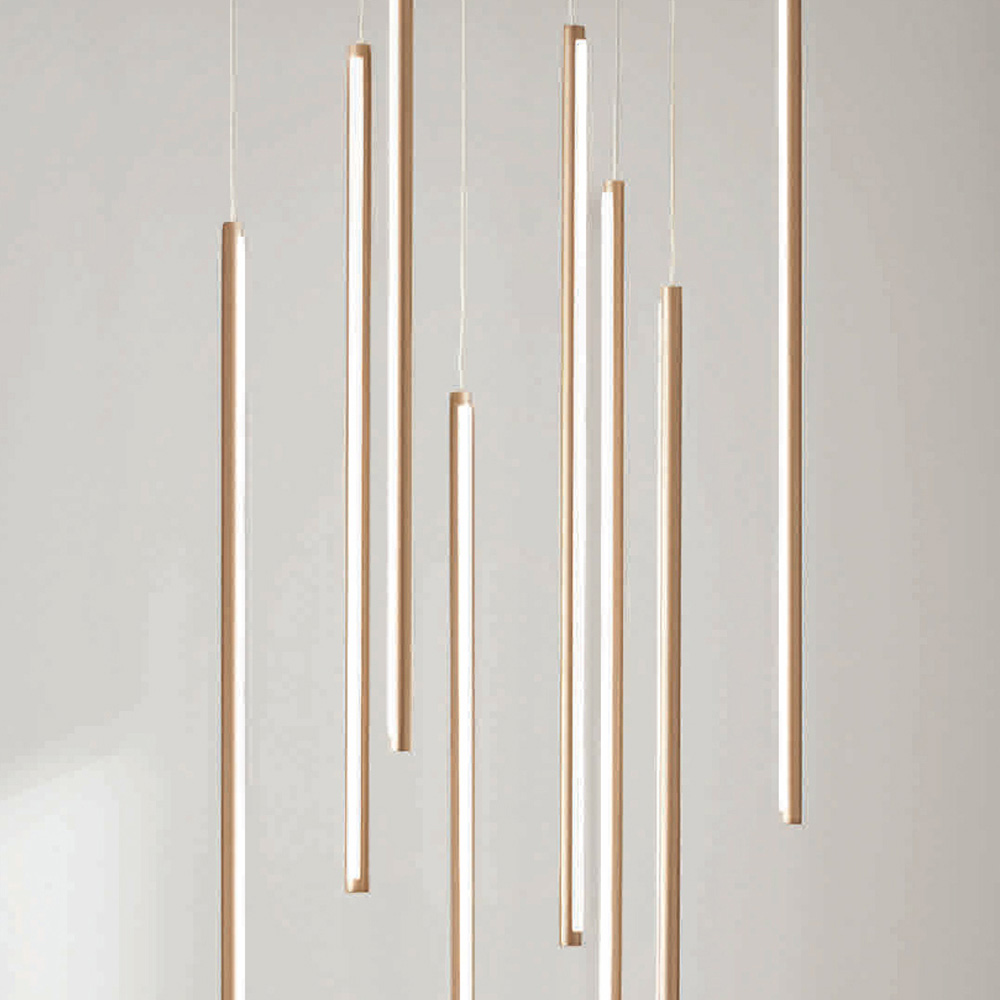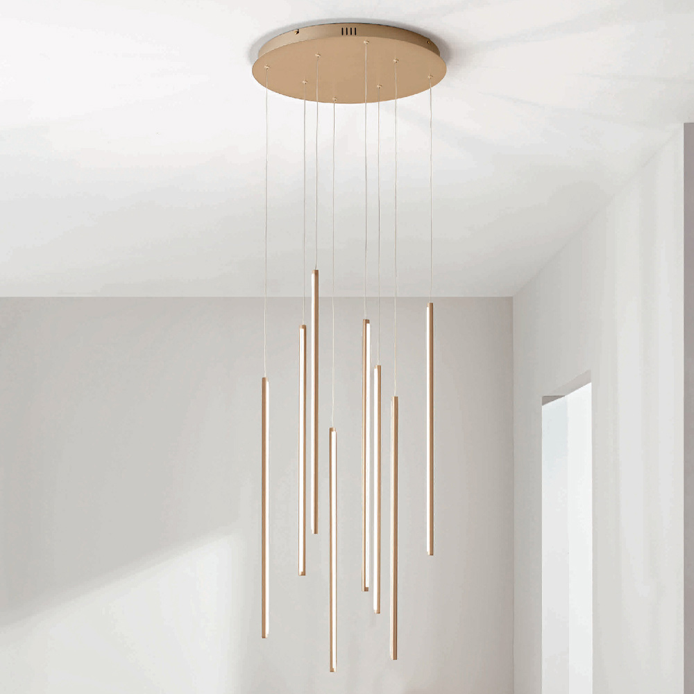 Araña íntegramente fabricada en Italia realizada en metal pintado acabado dorado con luzLED regulable y cables regulables en longitud. Este producto tiene como objetivo realzar la tradición a través de un enfoque contemporáneo donde el estilo, la clase y la innovación se fusionan para crear nuevas fórmulas de diseño para amueblar e iluminar cualquier ambiente con gusto y carácter. Los puntos fuertes son la peculiaridad de las formas , la calidad de los materiales y la singularidad de la fuente de luz .